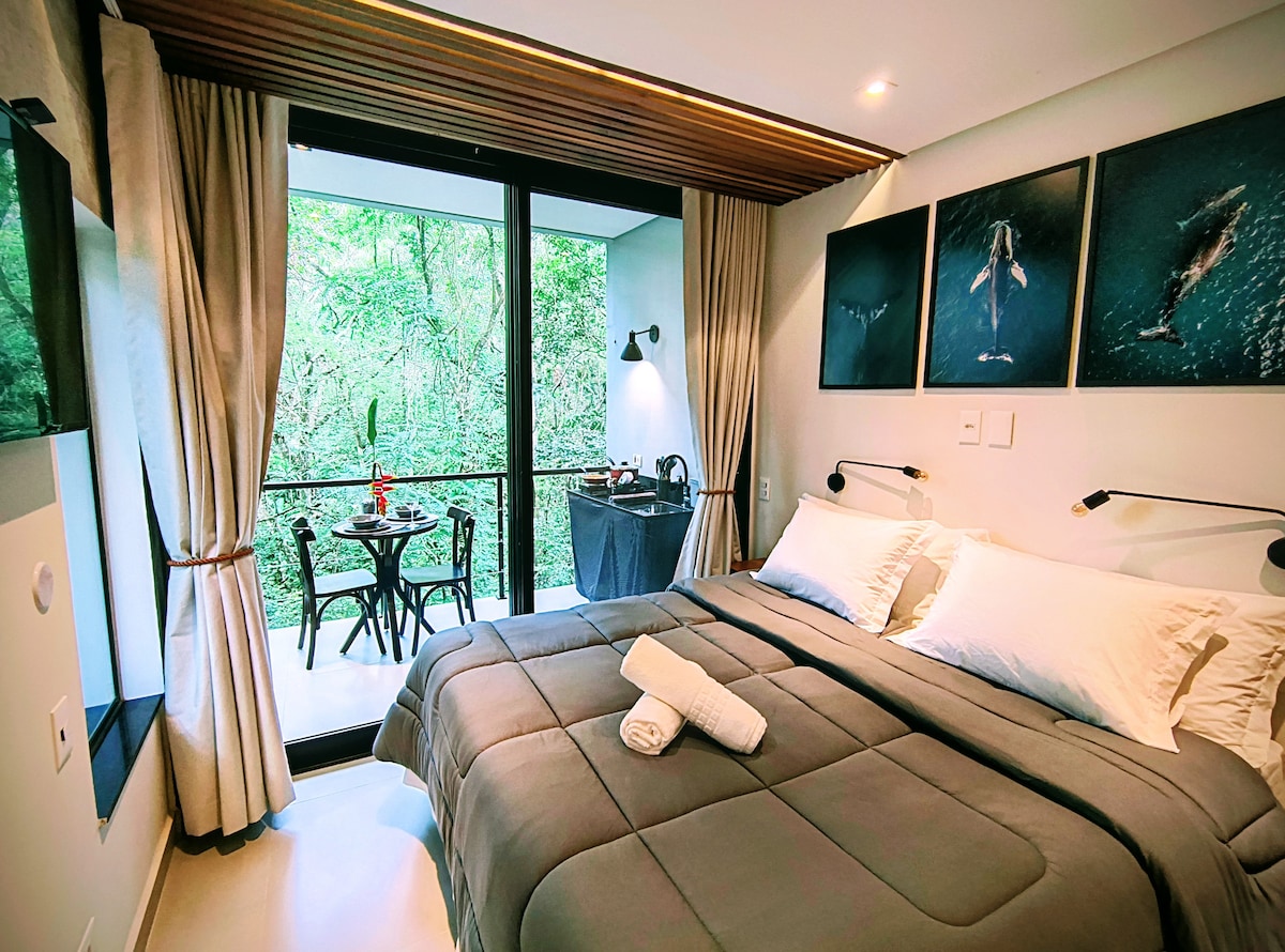 Oferecemos um espaço silencioso para os amantes da natureza! Ensolarado Estúdio na Praia Vermelha (centro) cercado pela Mata Atlântica e localizado numa colina de 60 m de altura com vista para o mar. O quarto oferece uma cama de casal e uma de solteiro, c/ TV de canais abertos e um deck com sol. Cozinha separada, com cook top, mini-forno, geladeira e utensílios básicos e um banheiro confortável. Obs: Roupa de cama e banho não estão incluídas mas pode ser alugados separadamente.