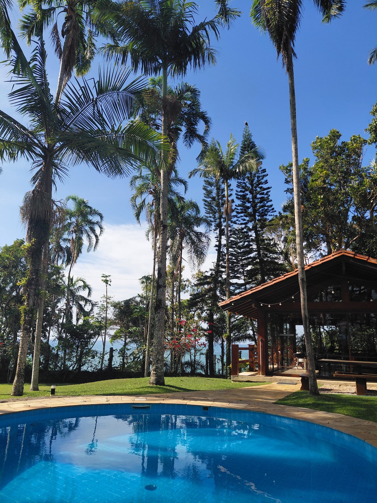 A place with the most incredible view of the sea, views of Flamengo Bay, Anchieta Island, Santa Rita Beach, Lamberto, Ribeira and others… With a private trail in the Atlantic Forest, 2 incredible viewpoints, small waterfalls with crystal clear water! With security and privacy, the Greece-themed house has a comfortable and structured 300m2, airy and fresh and with new air conditioning in all bedrooms. The closest beach is Lamberto Beach, you have to walk 400m, but we recommend going by car!