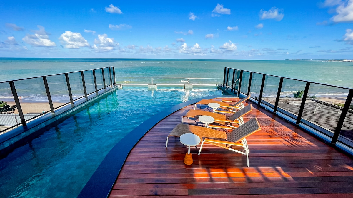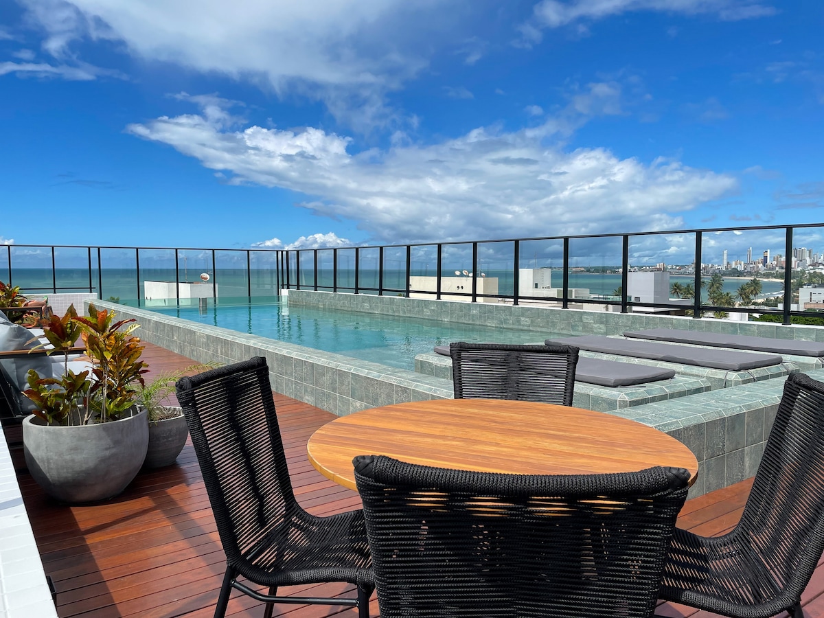 Tenha um pedaço do paraíso aos seus pés! Loft novo, recém mobiliado, em frente ao mar do Bessa, perfeito para famílias pequenas (até 3 pessoas) ou para viajantes individuais. Está dividido da seguinte maneira: lazer privativo com jacuzzi e vista mar privilegiada, suíte de casal com smart TV 50' e estação de trabalho, cozinha compacta e completa com principais utensílios, integrada com o quarto, tudo isso somado a uma belíssima vista do primeiro amanhecer das Américas.