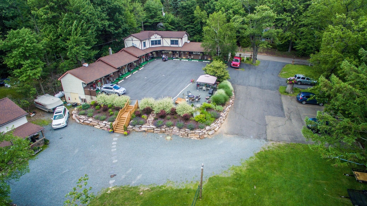 We are in the heart of the poconos 3 minutes outside Jim Thorpe. We have one of the best restaurants and seasonal patios attached to our lodge!! Come see us!!