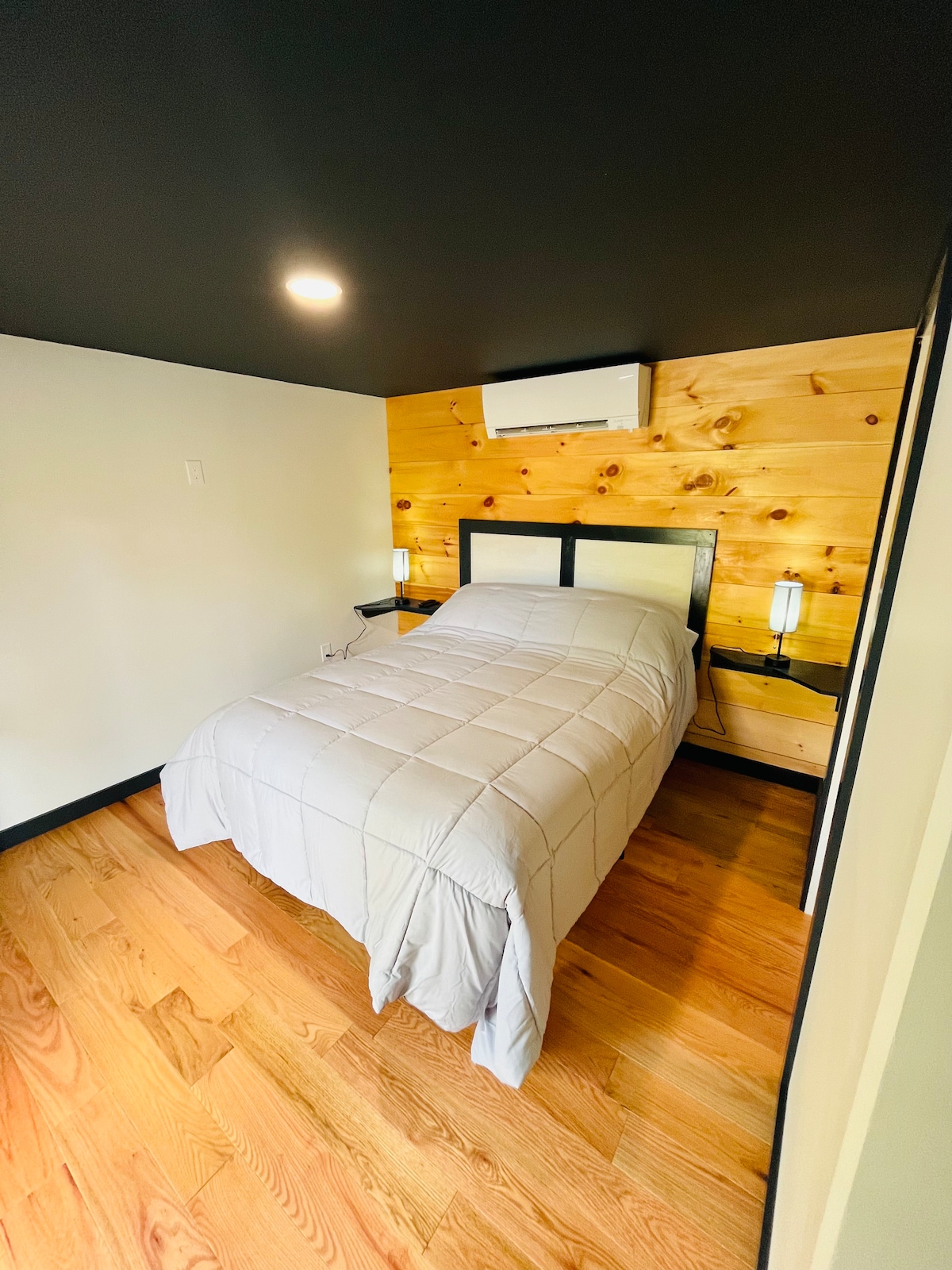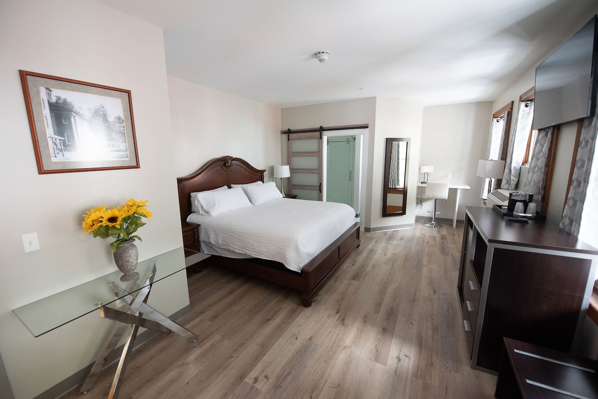 Enjoy a spacious king suite. Amenities include: Simmons Beautyrest Black luxury pillow-top mattresses Refrigerator in room Smart TV with Roku access Sliding barn style bathroom door Tub with Moen shower head In room safe Conair handheld garment steamer Free WiFi 24/7 Front Desk Staff to assist with needs