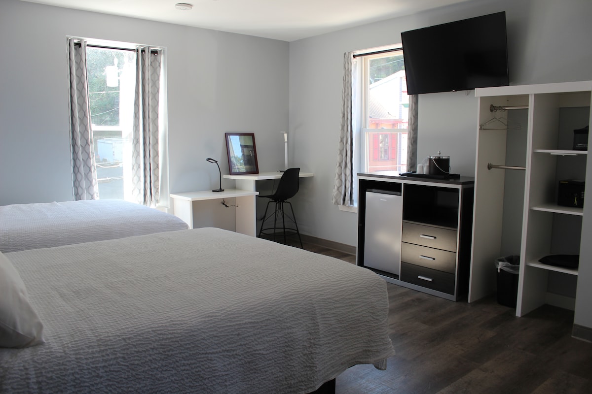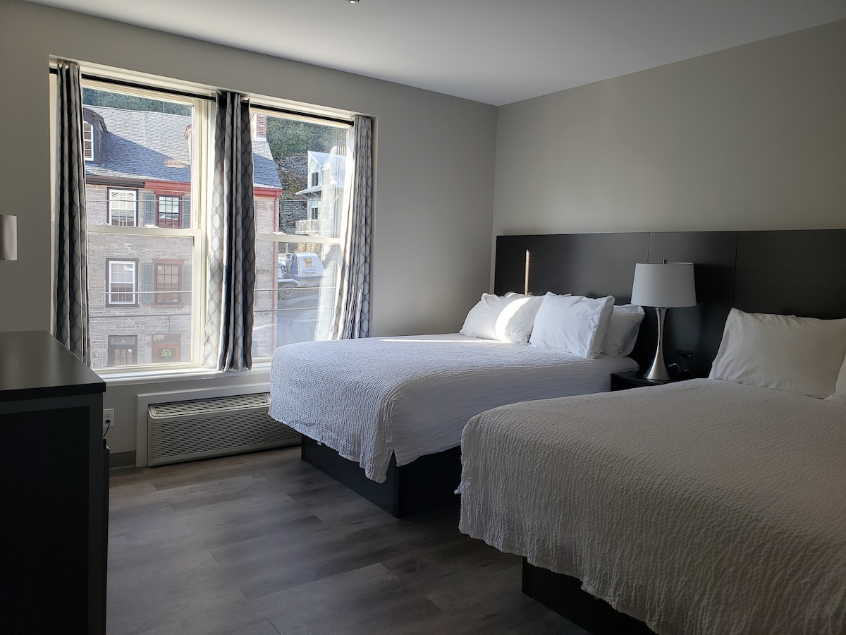 Enjoy a spacious guest room with 2 Queen beds. Amenities include: Original oversized windows with breathtaking views of Jim Thorpe Simmons Beautyrest Black luxury pillow-top mattress Refrigerator in room Smart TV with Roku access Sliding barn style bathroom door Glass door walk in shower with Moen shower head In room safe Conair handheld garment steamer Free WiFi 24/7 Front Desk Staff to assist with needs