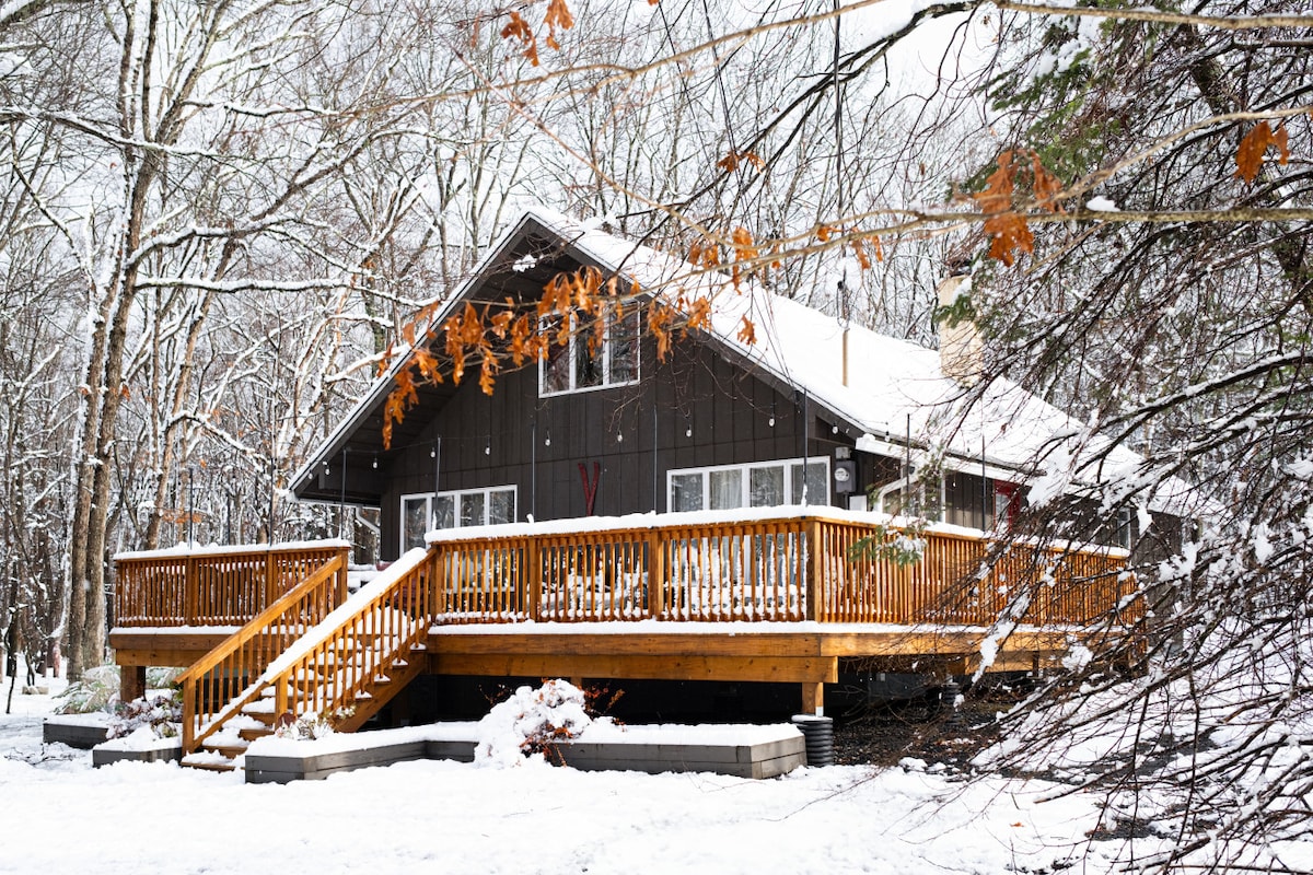 Escape to SantiCabin — a luxe cabin retreat in the Pocono woods. Enjoy a private hot tub, outdoor barrel sauna, indoor wood-burning stove, outdoor fire pit, 4K home theater, and game room. Minutes from Jim Thorpe’s holiday town, the scenic train ride, trails, and top ski resorts. A peaceful winter getaway for couples, families, and small groups. Relax, recharge, and enjoy the magic of a quiet snowy escape. • Big Boulder - 15 min • Jack Frost - 18 min • Blue Mountain - 28 min