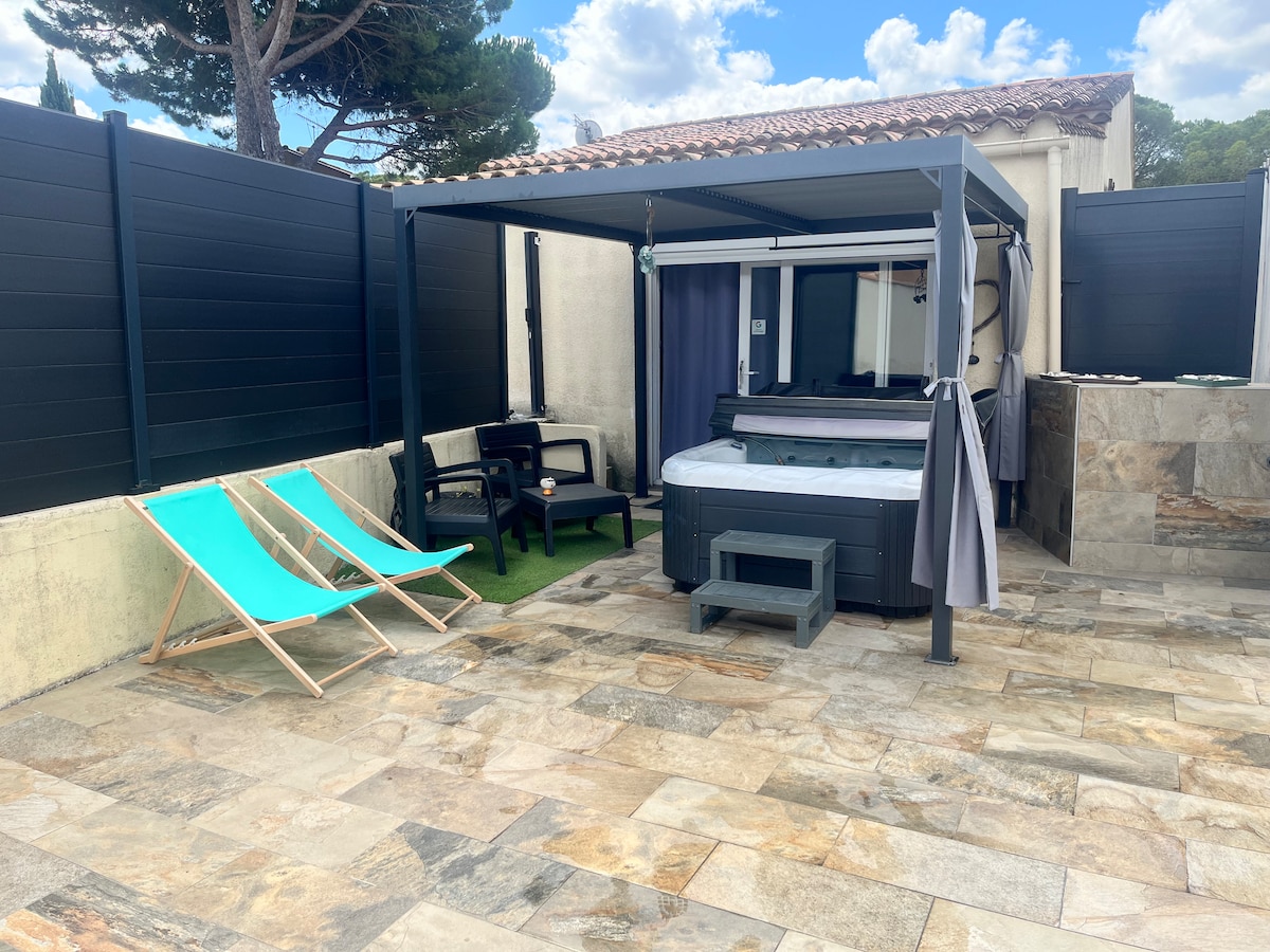 Merci de bien lire le règlement intérieur avant réservation ! Jaccuzi Cuisine équipée salle de douche a l'italienne WC billard TV bluetooth wifi. Un véritable cocon avec lumière d'ambiance. Repas possible sur place réservation minimum 48h a l'avance A 10 min de la cité de Carcassonne et du lac de la Cavalière. Nombreuses activités a proximité et randonnées Accès à la piscine en haute saison le matin de 9h à 13h. Jaccuzi privatif Sans vis à vis