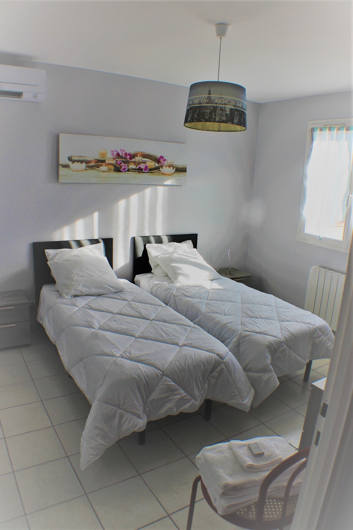 Chambre Clémencia : Grande chambre équipée de lit double 140x200 avec vue sur le canal. A 2 minutes à pied de la gare et de la navette de l'aéroport et 25 minutes à pied de la cité de Carcassonne. Possibilité de louer plusieurs chambres à la fois ( tarifs dégressifs) Salle de bain partagée et salle de repas (micro-onde, frigo, cafetière, bouilloire) réservées exclusivement aux voyageurs. Petit déjeuner offert nous avons 2 autres chambres au même tarif consulter mon annonce