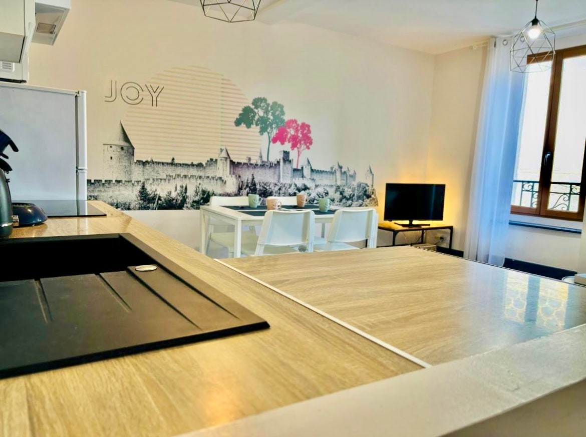 Niché au cœur de Carcassonne, L'Étoile Rouge est un charmant T2 cocooning. Cuisine et salon en palette rouge et noir, ambiance chaleureuse et contemporaine. Chambre spacieuse en blanc minimaliste : sérénité et intimité garanties, literie premium. Toutes les pièces sont proches, parfait pour rester ensemble. À quelques minutes de la Cité médiévale. WiFi fibre, climatisation, lave-linge. Un week-end en amoureux mémorable vous attend.