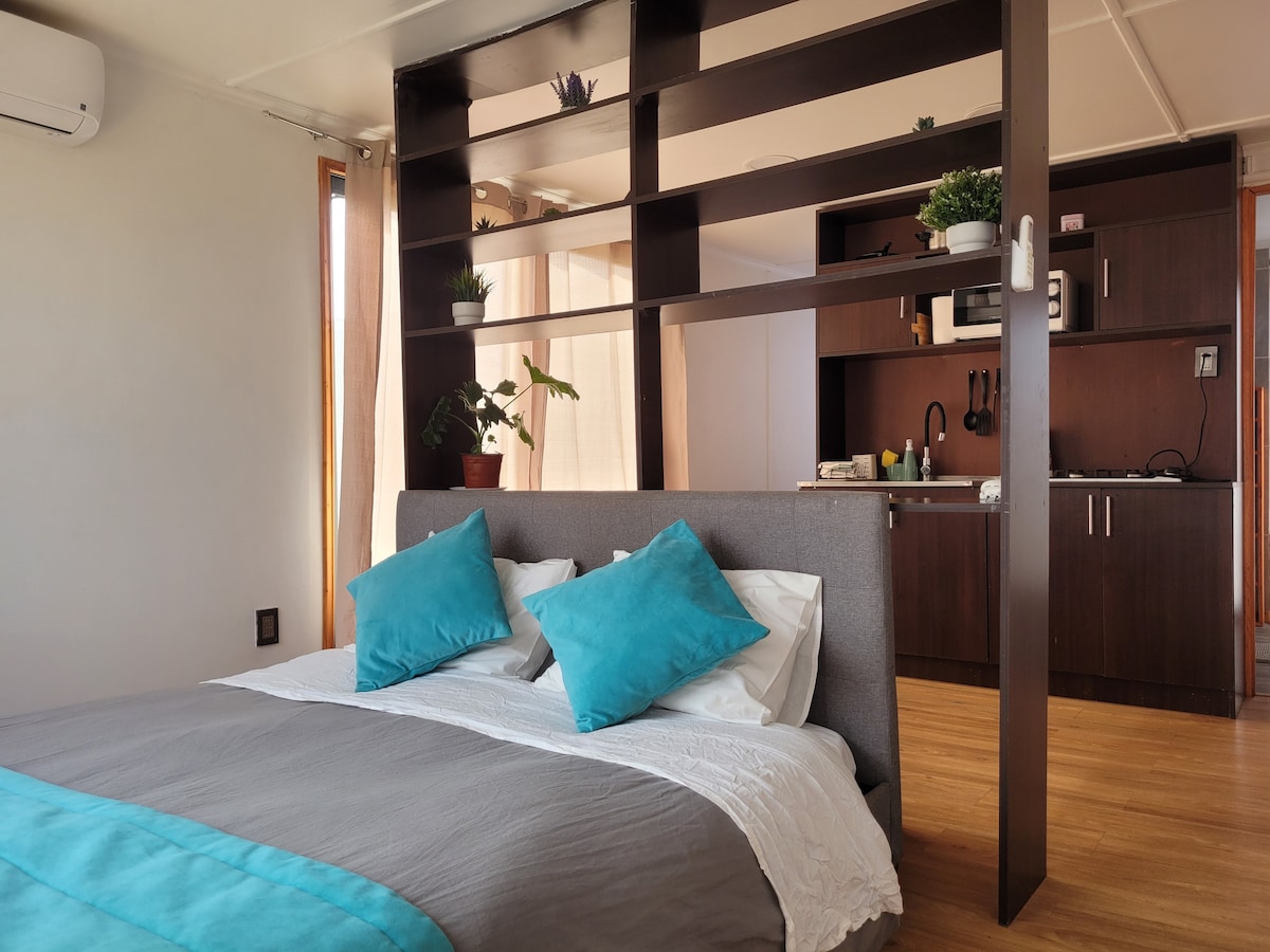 Relájate en esta escapada única y tranquila. Te encontraras con un departamento para 2 personas completamente equipado, emplazado en un lugar que te invita al descanso y deconexión. Despertar con vista a un bosque, y escuchando el sonido de la naturaleza. Cuenta con cocina equipada para 2 personas, terraza con parrilla a gas.