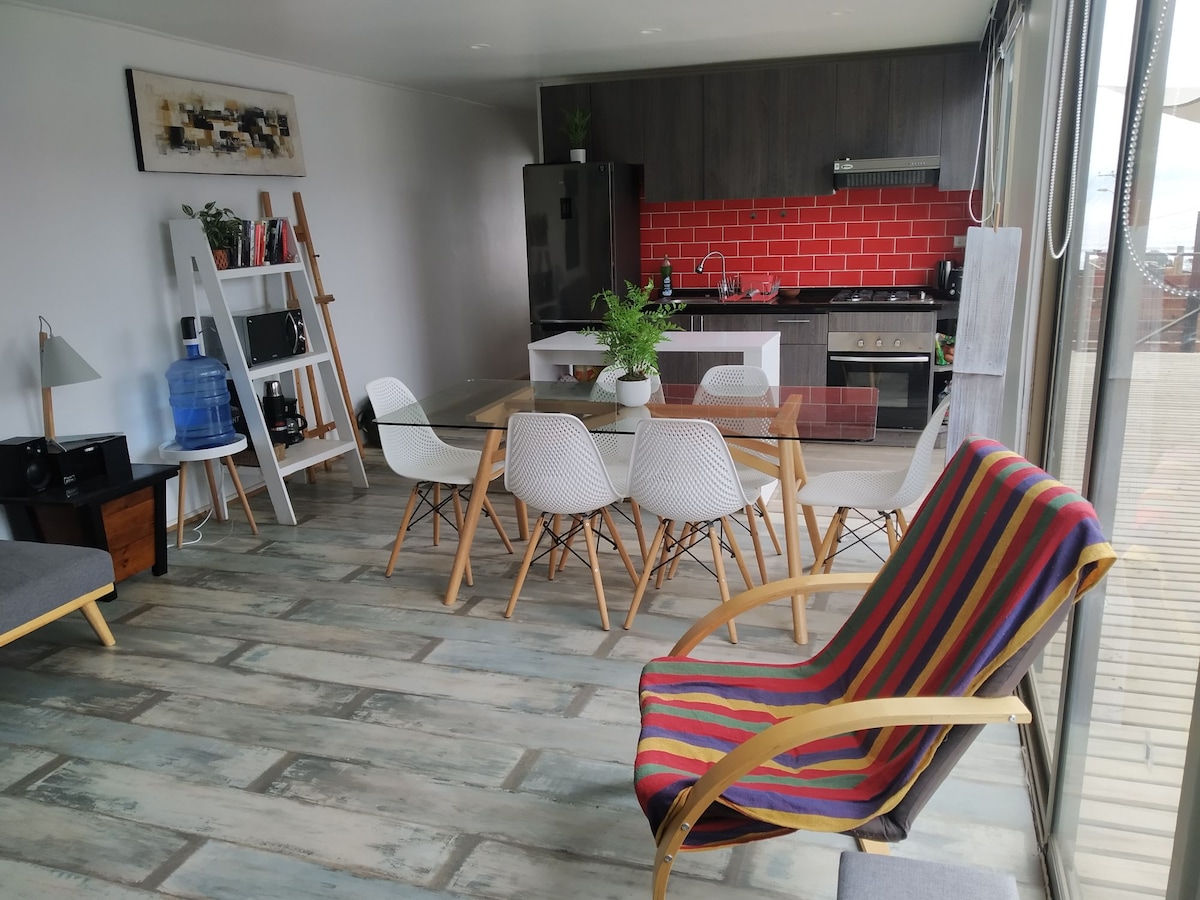 Departamento para dos personas, completamente equipado. Ubicado en un lugar residencial y tranquilo, ideal para descansar y desconectarse. A pasos del recientemente inaugurado “Humedal Urbano El Bajel”, un paseo hermoso, ideal para caminar y observar el impresionante reservorio de aves y vida silvestre. Cuidamos la tranquilidad que buscas, por lo tanto están prohibidos los ruidos molestos, fiestas, reuniones hasta tarde y/o visitas externas. Te recomendamos leer nuestro reglamento.