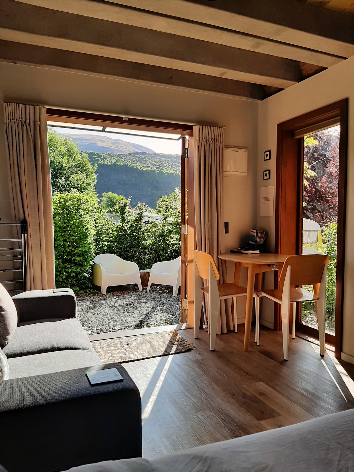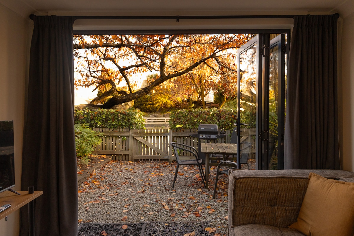 Welcome to our modern oasis! Experience luxury in our newly-built studio apartment, boasting a beautiful Valentino-tiled bathroom with dual showers, underfloor heating, and a heated towel rail. The ambiance is enhanced by solid timber floors and a cozy fireplace in winter months. Indulge in relaxation on your private back deck, complete with a luxurious standalone bath. Meanwhile, the front deck offers serene garden views onto the Arrowtown reserve, with the tranquil river as your backdrop.