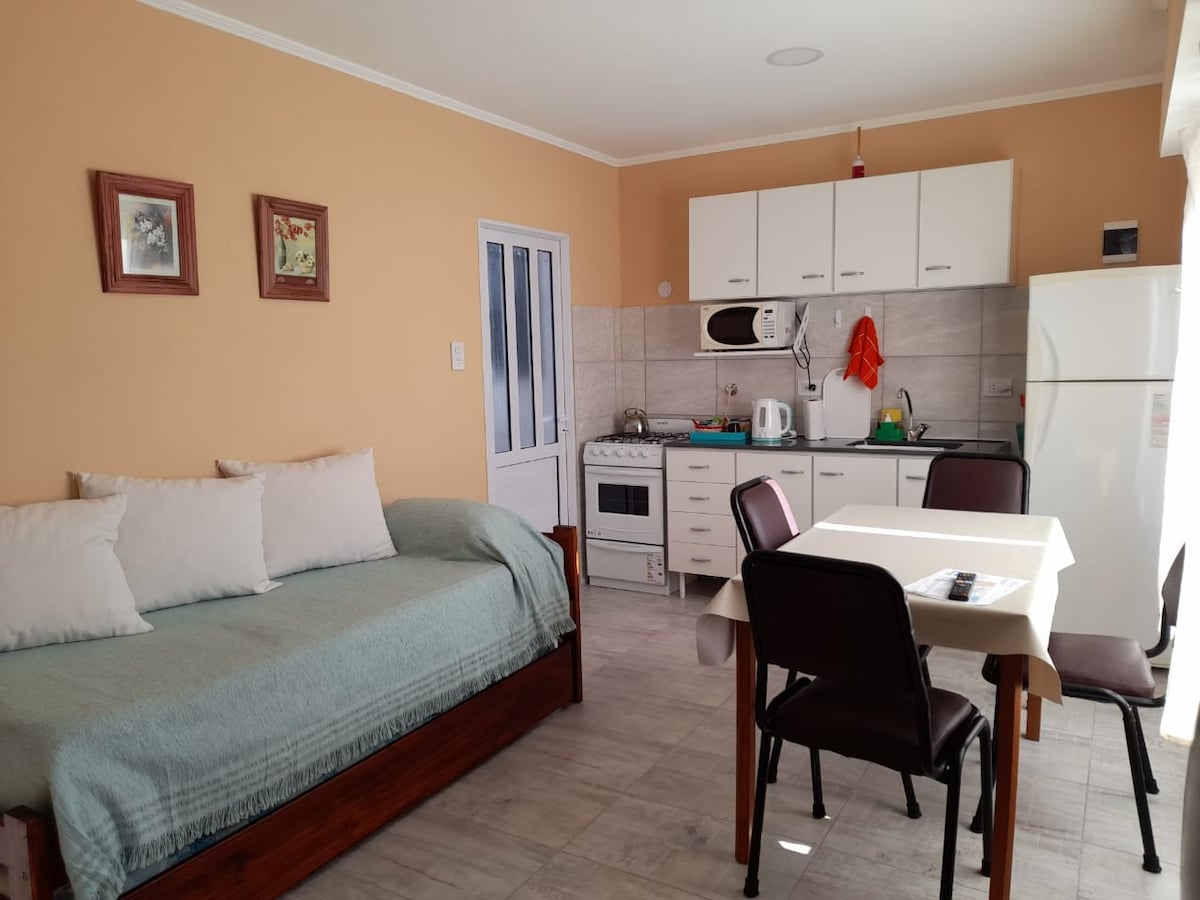Habitación acogedora: Una cama matrimonial y una cama individual, ideales para parejas, familias pequeñas o amigos. Cocina equipada: Anafe, heladera pequeña, microondas y horno eléctrico para preparar tus comidas favoritas. Baño completo: Incluye ducha con agua caliente para tu comodidad. Comodidades adicionales: Aire acondicionado, televisión, WiFi y un ambiente luminoso y fresco gracias a sus grandes ventanas y diseño funcional. ¡Te esperamos!