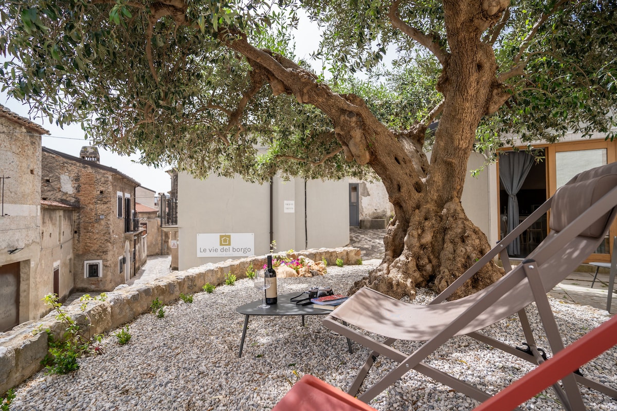 Antica casa calabrese a tre piani con giardino nel centro storico di Strongoli. La scala interna col soffitto decorato porta al primo piano: un grande soggiorno con camino a legna, una grande cucina con camino, due stanze matrimoniali e un bagno. Al secondo piano vi sono due stanze più piccole e un bagno. Sui tetti una terrazza panoramica. Al piano terreno un giardino pensile una piccola cappella e forno per il pane. Davanti al portone una macina in pietra di epoca romana accoglie i visitatori.