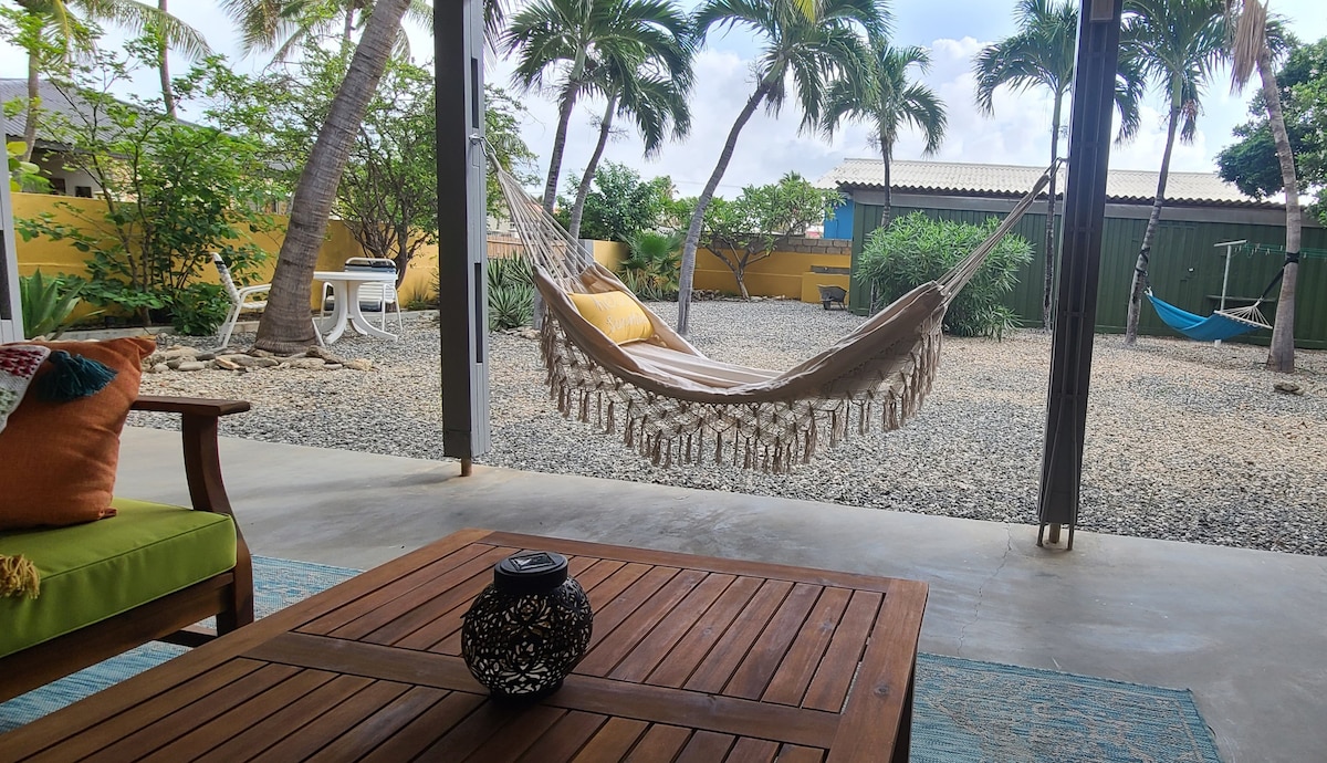 Only 1 min walk from Bachelor Beach! Adult Only. Perfect location for divers, kiters, and surfers. Exactly between the popular beaches for windsurfing (Sorobon) and kitesurfing (Atlantis) and the City Center (all in 5min). Design studio appt. with beautiful skylights, generous kitchen with bar, spacious ensuite bathroom. Private parking, smart tv, lovely garden with plenty of palm trees, bbq, and chill space. All linens included. High-speed WiFi (fiber).