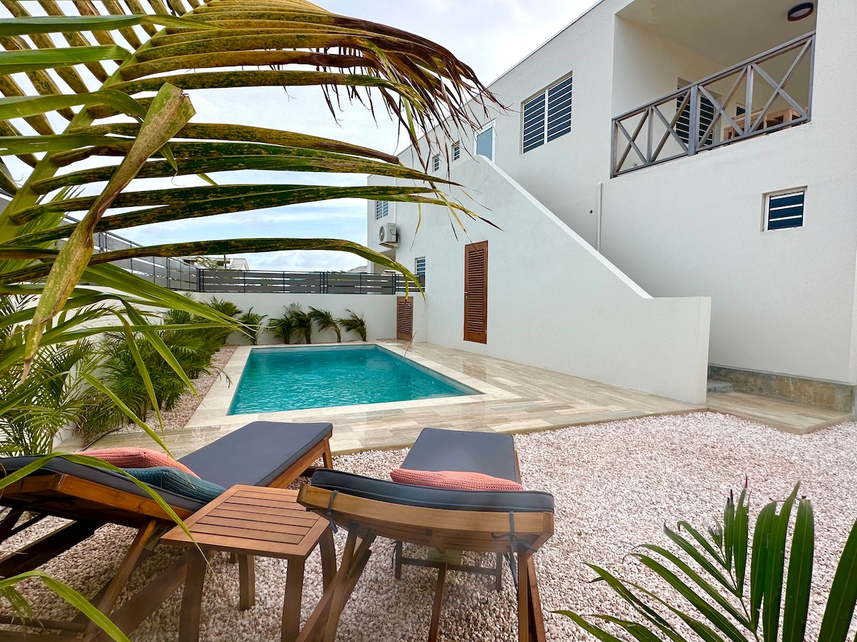 Deze centraal gelegen volledig gekoelde accommodatie is niet alleen smaakvol ingericht, maar heeft ook veel ruimte zowel binnen als buiten en eigen zwembad. De accommodatie is gelegen aan het water, ook wel de lagune genoemd waar de Caribische Zee uitmondt, met eigen aanlegsteiger. Maak je niet over het vliegveld wat dichtbij zit, het is een klein vliegveld en je hoort er helemaal niets van! Voordeel: de stranden TeAmo en Donkeybeach op loop afstand.
