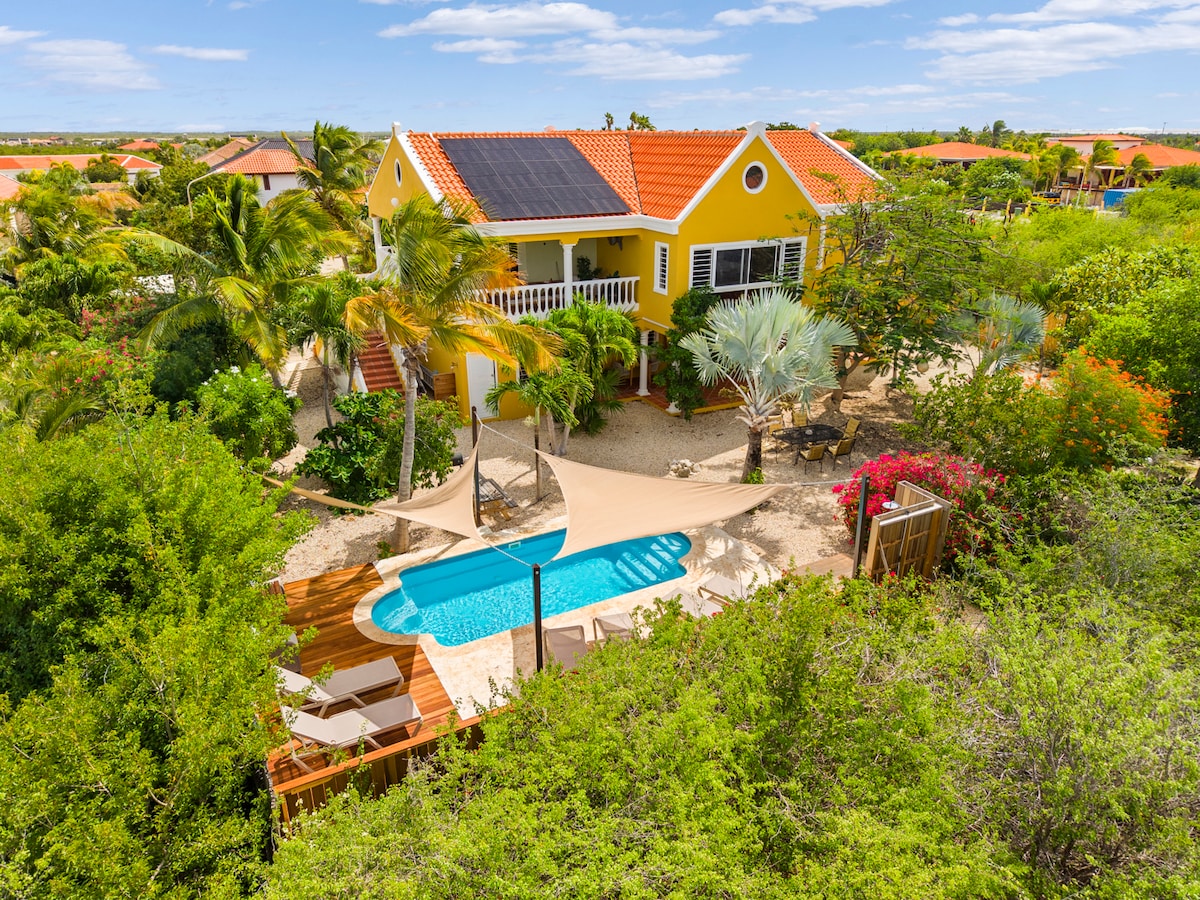 This luxury Villa with private pool is located in Playa (center of Kralendijk) with just two walking minutes to the ocean. A lively but still quiet neighborhood. The very heart of Kralendijk you can reach within 15 minutes walking. We provide a fully equipped kitchen, a 70 sqm spacious living room with all your heart desires. A widely set covered porch at the backyard with direct access to the private pool with sunchairs are at your disposal.