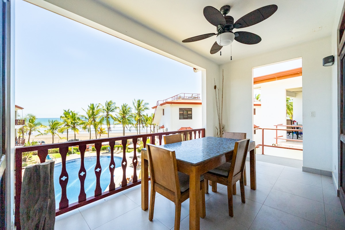 Take in sweeping ocean and sunset views from the 3rd floor of this corner property, with even better vistas to be had from the wicker chairs on the terrace. After a dip in the pool, rinse off under the rain shower in a twin-vanity bathroom. Direct oceanfront with great surfing right in front and located in the center of Jaco where you can easily walk to all of Jaco's shops and restaurants. Please no party groups and strict no guest policy. This listing is has many great reviews, just switched over accounts, check out reviews from other guests here https://www.airbnb.com/manage-your-space/3091501/details My wife and I live in Jaco full time so we'll be able to help you with everything about your trip. We have local discounts to all of the area tours and activities and can also recommend Jaco's best restaurants. Rent a surfboard and organize a lesson from the sands right in front of the property. Catch the big breakers here, or opt for some easier waves to the south. Walk into town to find a good selection of places in which to eat, drink, or shop. Taxi's into town are just $2-3, or you can easily walk/bycycle. No guest policy, maximum 4 people.