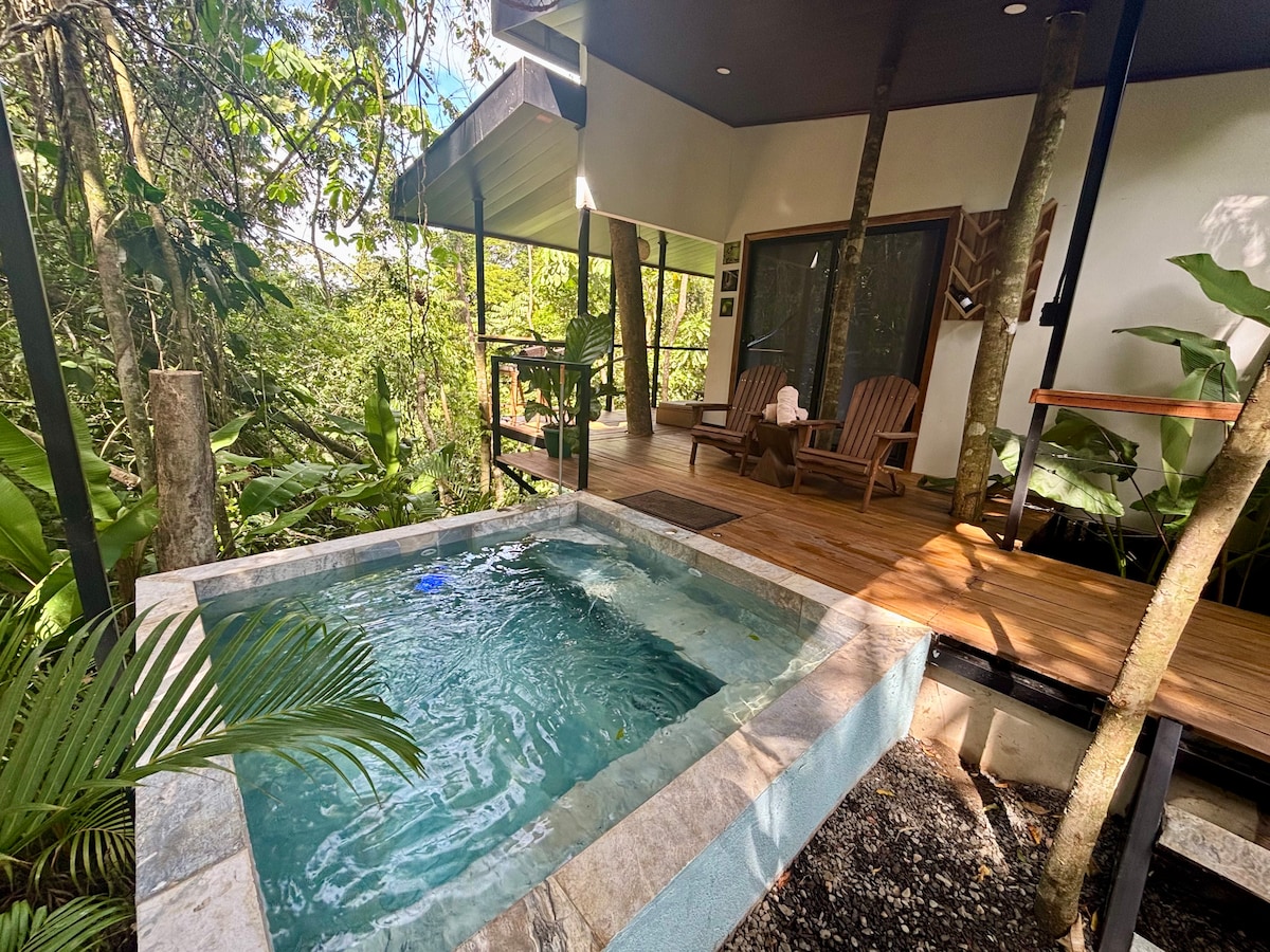 Unique and modern rainforest cabin from experienced local host 🙌🏼 Nestled in private primary rainforest of 10 acres, the cabin offers a serene retreat where nature & comfort meet. Unwind in your own private heated hot tub, listen to soothing nature sounds, and embrace complete rainforest peace. Explore our private trails, river and natural outdoor pools. Modern boutique cabin with two beds, full kitchen, nature views & open shower bathroom. Located 2h from SJO. Local owned ✌️🇨🇷