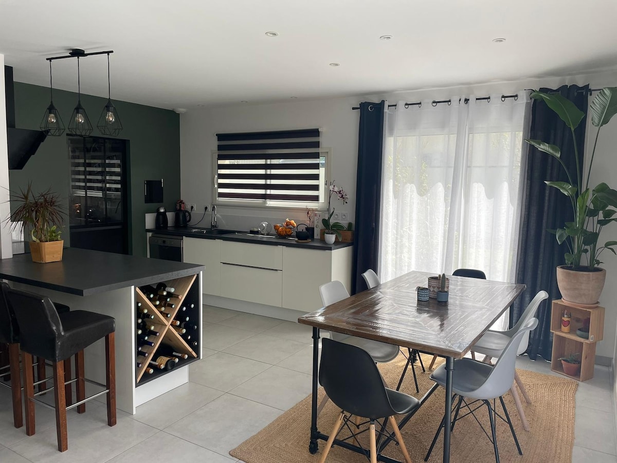 A 15 minutes du centre de Bordeaux, dans un environnement calme et verdoyant, maison (dépendance) de 42m^2 dans un style chaleureux et contemporain. La maison comprend une chambre avec lit double, une salle d'eau et un salon/salle à manger doté d'un couchage supplémentaire (canapé lit convertible). Vous pourrez profiter de la piscine aux beaux jours. Afin de respecter la tranquillité du voisinage, les fêtes sont interdites. La capacité maximale est de 4 personnes.