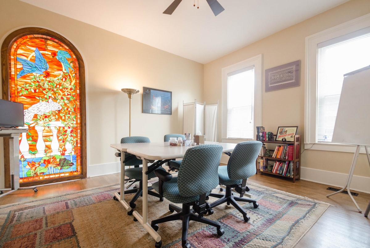 Combine business with slumber - and bring your baby along! This guest house is designed with work/business meeting space on the ground floor, but is also a fully equipped home with sleeping quarters upstairs. Sleeps 2-3, seating for 8. 1 standard bed & crib/twin airbed option in 2nd BR. There's a large deck out back with a picnic table and grill. NOTE: We only accept guests whose Airbnb verification includes a government issued photo ID for the primary guest who will be in residence.