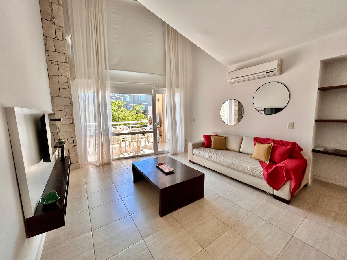 MODERN AND BRIGHT DUPLEX WITH AMENITIES JUST STEPS FROM THE BEACH – UP TO 6 GUESTS Master bedroom with balcony and a second with 2 single beds. Living-dining room with a sofa bed for 2 guests. Kitchen: refrigerator/freezer, microwave/electric oven, and washing machine. 2 full bathrooms upstairs and a guest toilet on the ground floor. Safe – Beach chairs Hot/cold AC and ceramic heating panels Bed linen and towels included Heated in/out pool plus outdoor pool. Dry and steam sauna Gym Parking