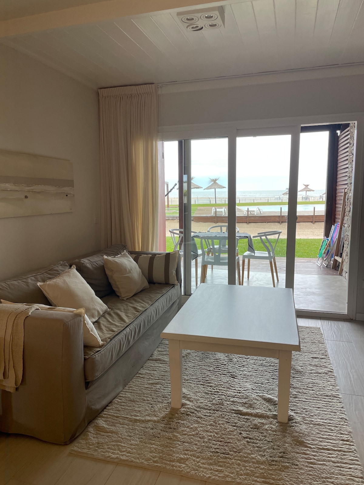 Departamento amplio y luminoso en complejo vacacional a metros de la playa (cuenta con servicio de playa en temporada: sombrilla y sillas y reposera incluido) Pileta climatizada externa y cubierta, gimnasio y spa Amplio dormitorio con cama King que puede dividirse en 2 camas individuales. Dos sillones cama adicionales en el living