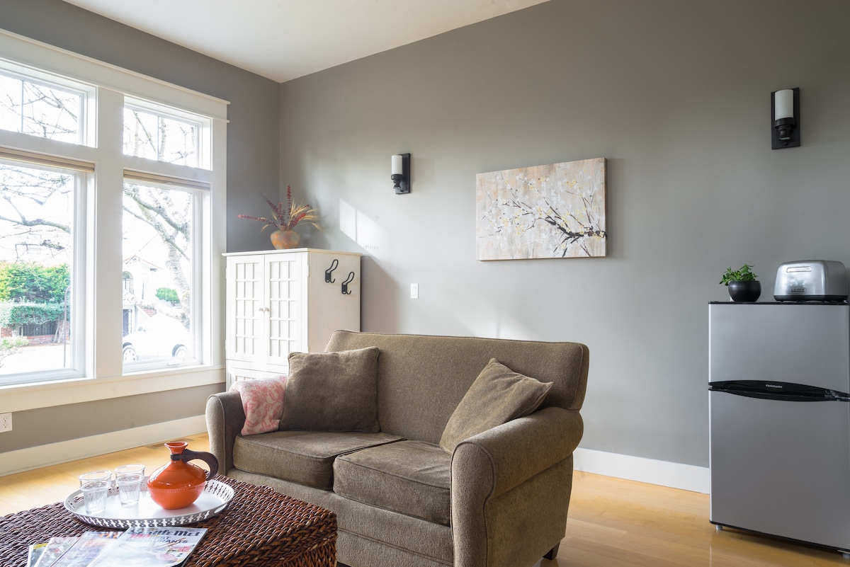 Clean-Comfort-Style! Private garden-suite & entrance. Minutes to Puget Sound: beach, hiking, play areas. Walkable quiet neighborhood with Olympic Mt. views Nearby: Trendy Ballard & Greenwood Ave: Top Seattle restaurants, cafes, boutiques, craft breweries, music venues, farmers market & the Ballard Locks, Woodland Park Zoo & Green Lake. Northgate Station light rail & ice rinks. Easy access to the airport /downtown. xfi internet (fast) Cable TV-Stream Downtown: 8 mi Free: parking, coffee/tea