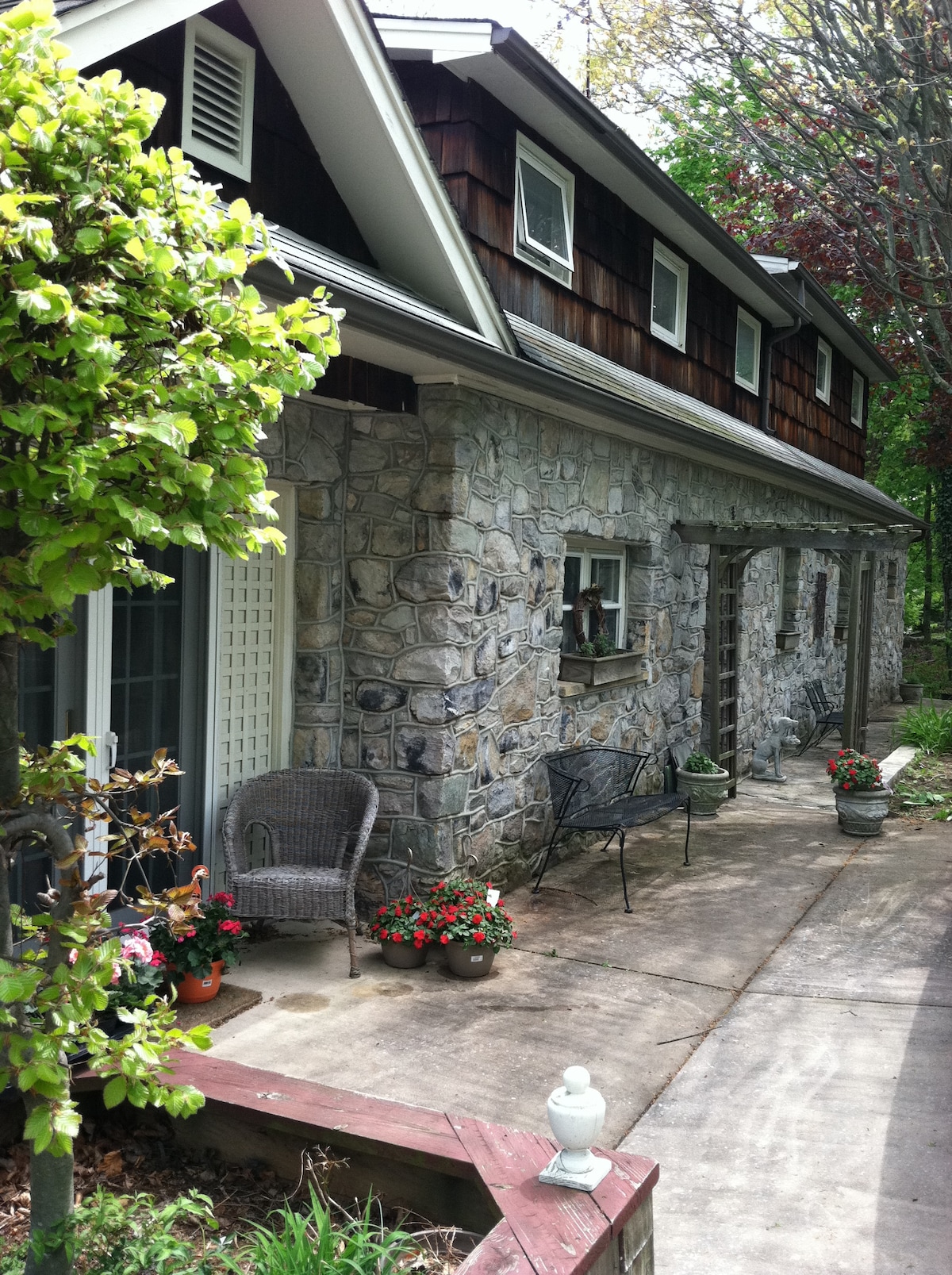 Off the beaten path but close to it all, including historic Gettysburg, the Appalachian Trail, Caledonia State Park, and Michaux State Forest. Relax on a large screened-in porch, in the shade of our pines or on the banks of a mountain creek. Access your own streaming accounts through our TV/wifi. Great restaurants are nearby, or make use of our original 1950s efficiency kitchen and dine al fresco. You’re surrounded by wineries, farm markets and even a candy store. Central location to do it all!
