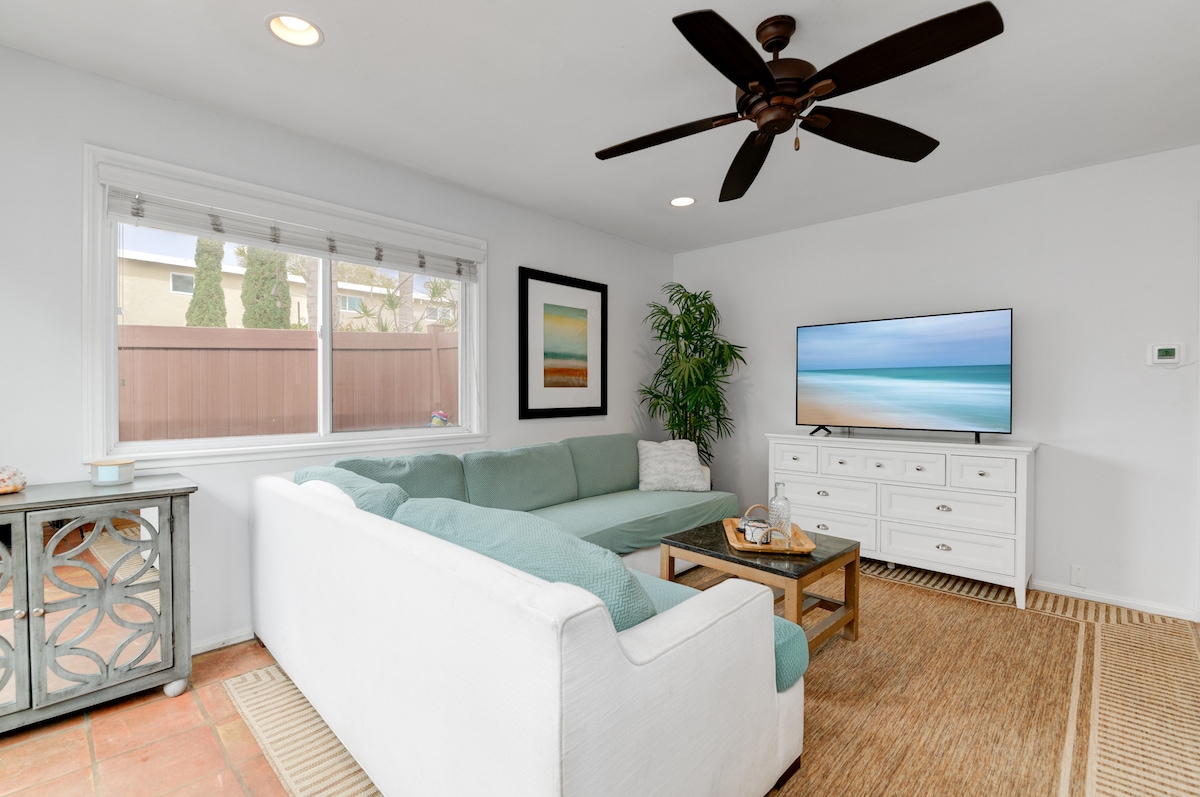 Beachside Bungalow is located in the heart of Carlsbad Village just steps away from the beach, restaurants, and bars. It is newly renovated with two outdoor lounging/dining areas and includes covered reserved parking, a king-size bed, a queen-size sofa bed, fast wifi (WFH friendly), large smart TV, a fully equipped kitchen, beach accessories (chairs + towels), and AC in the bedroom so you can sleep comfortably all summer long.