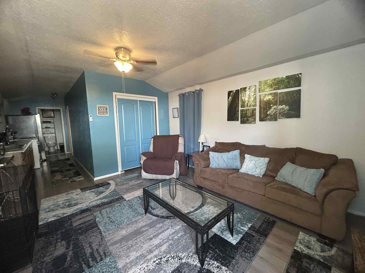 If you’re looking for a cozy, safe, clean and affordable stay with a unique twist? Then this is it, because breakfast is included and brought to the door by Big Dogs Food Truck. This is a newly renovated 1 bed room house with a full kitchen and coffee set up. There’s a brand new washer and dryer with detergent available. It has a 65 inch TV with surround sound. There’s a queen size bed and a hide away couch for sleeping arrangements. This is a quiet and safe neighborhood.