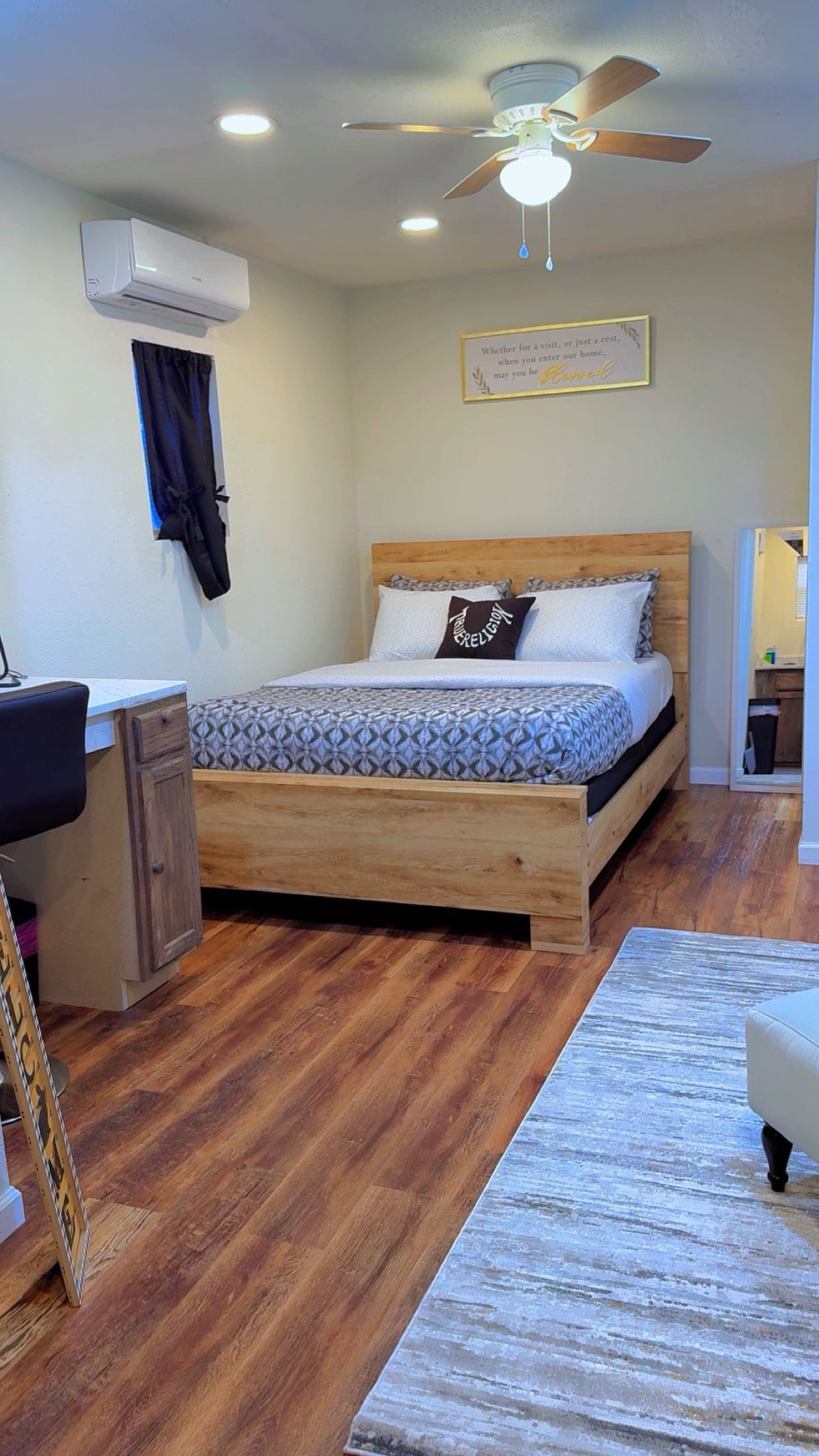 Keep it simple at this peaceful and centrally-located place. The casita is a separate house. You have your own entrance for privacy, your own fenced in yard with a grill and car port. We did a complete renovation and added a new fridge and new washer and dryer. All new kitchen ware. Dishes, coffee pot etc. Brand new furniture as well. We are proud of our hard work and happy to open up our home to you. King size bed and twin size air up mattress.