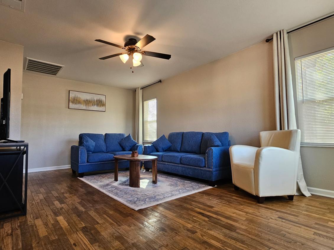 Welcome to the Blue Nest! Your perfect home away from home. Fully equipped 2 bedroom, 1 bathroom, 1 car garage home. Your family will be close to everything when you stay at this centrally-located peaceful home. This cute & comfortable home features a smart TV located in the living room, master bedroom features a king bed, second bedroom features a queen bed, extra blow up mattress upon request. Fenced in backyard with enclosed patio, BBQ grill, washer and dryer. 1 mile to the Pecos River!