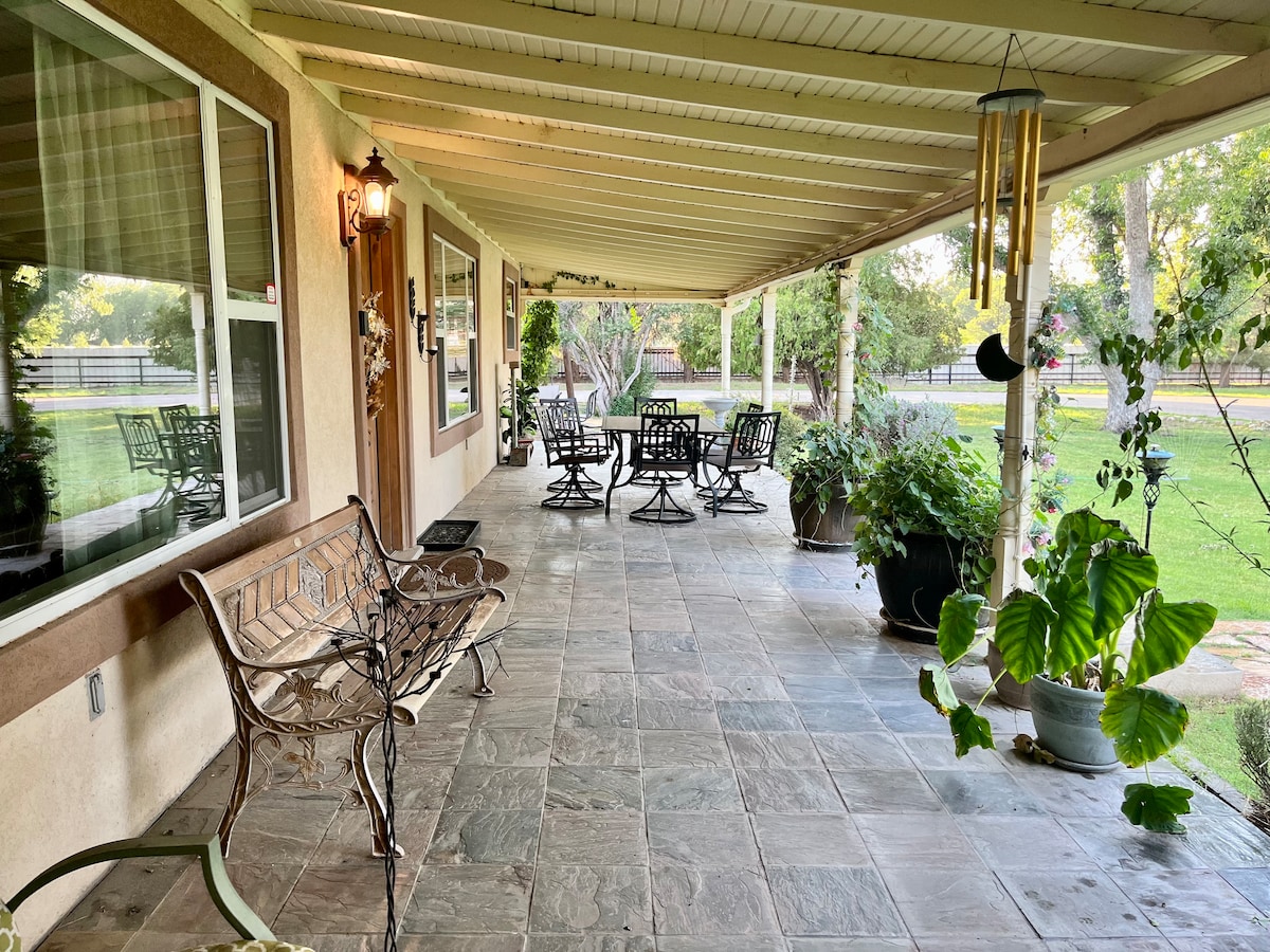 This home has wood floors. 1200sf. Front porch with seating overlooking flowers and fruit trees. Huge fenced-in back yard with 2 large trees and a fire pit with seating and a grill. Wine fridge. 2-car covered parking. Quiet neighborhood. Some board & video games for the kids. My husband and I are people that love life and people. We have put so much love into this home, I'm sure you will be comfortable! Also suitable for the fur babies!Check out the Blue binder for rules & points of interest!