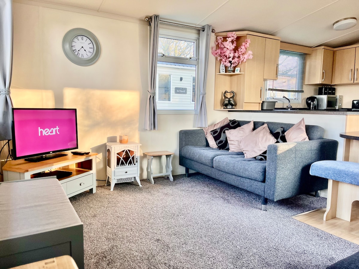 Bright and airy two-bedroomed caravan with decking and patio area. Very quiet and in a corner spot next to woodland, close to marina, lovely secluded walks. Restaurant and bar within minutes walk. Gym, pool and sauna on site (details provided if requested). Beach is 10 minute drive or can access public transport just outside park. Theme park and wildlife park nearby Numerous bars and restaurants and places of interest. Train station within walking distance.