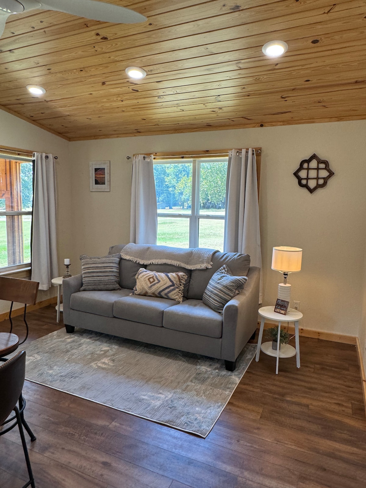 This chic spacious open studio is the perfect space for two people awaiting a lake view private getaway. A plush queen size bed, jacuzzi tub, fireplace, A/C, kitchenette, and full sleek bathroom will be at your fingertips. Fully furnished from top to bottom allows for little packing. A full wall of glass captures the entire lake from top of the ridge. Grill on the secluded patio and experience your own unique sunset. Sit by the campfire to disconnect.