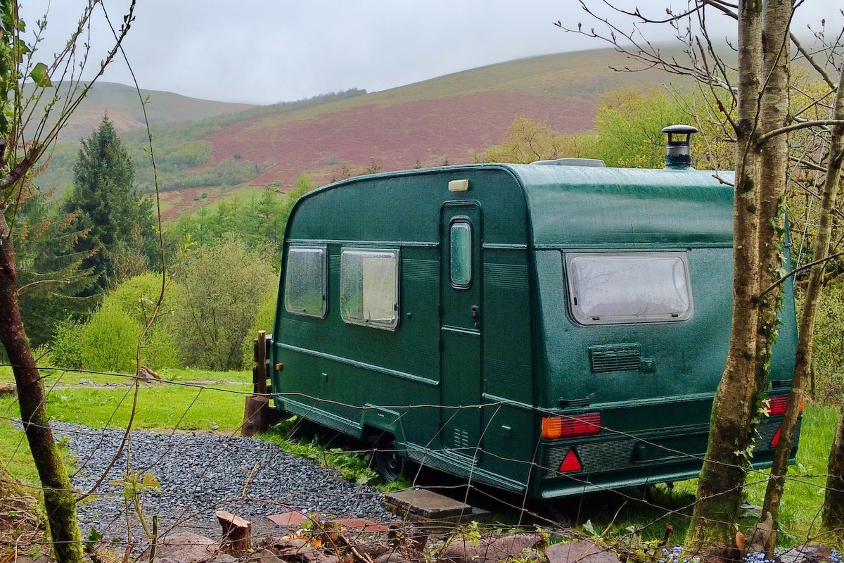 Come and stay with us on our Welsh sheep farm, eco friendly campsite, in our cosy upcycled caravan (rescued from caravan "Heaven"). Secluded space, complete with wood burning stove & fire starter pack and comfy double bed. Enjoy sitting by your own private fire pit with spectacular panoramic mountain views at any time of the year watching the expanse of starry skies. Plenty of space to relax and breathe.............