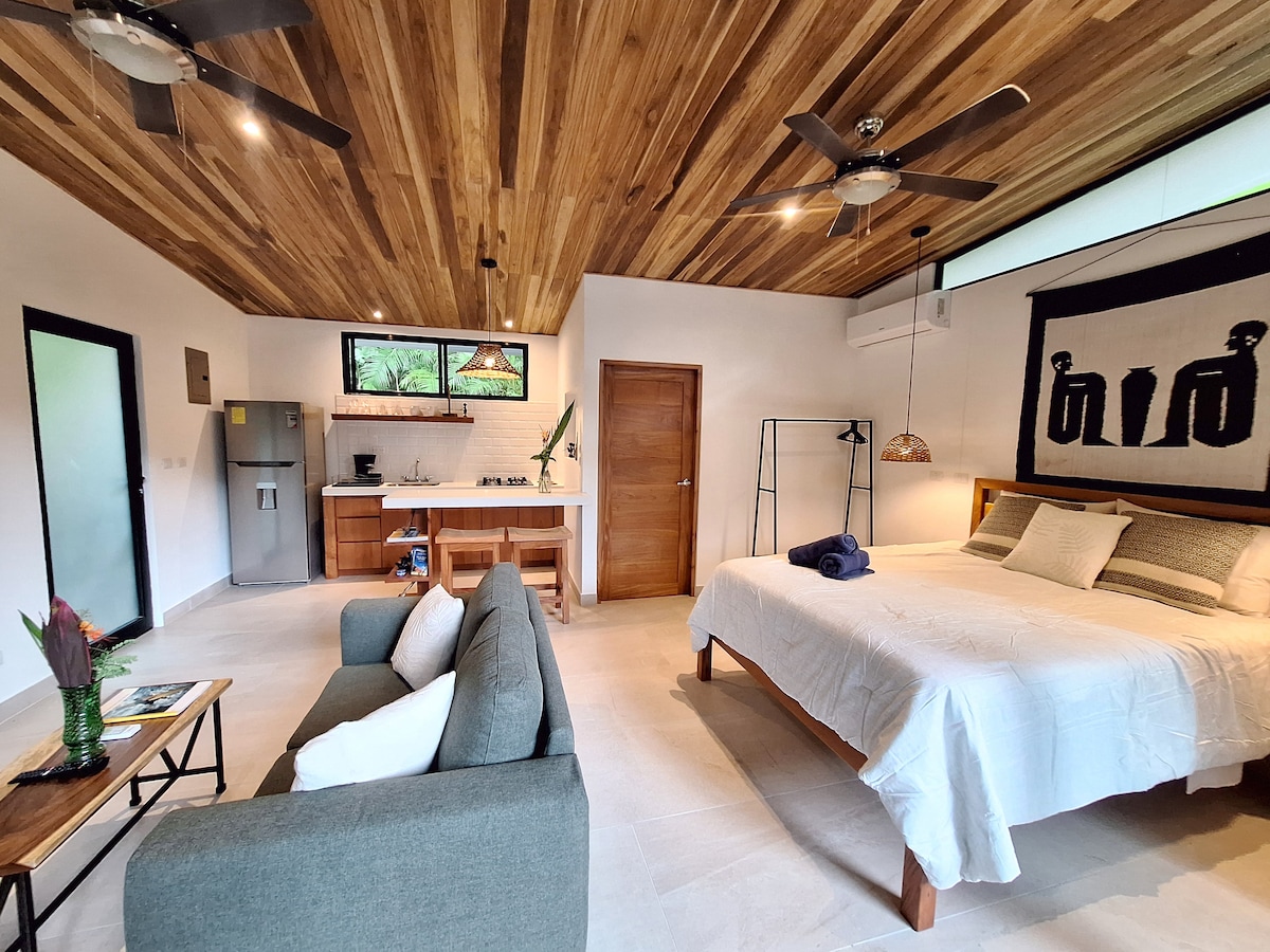 JUST MINUTES’ WALK FROM THE MAJESTIC BEACHES OF MALPAIS, this modern home sits in a lush retreat community with 24h security and a gorgeous shared pool. Only 700m from Santa Teresa’s crossroads, restaurants, banks, and shops, it offers a peaceful escape perfectly balanced with a lively town vibe. The stylish studio features flexible sleeping, exquisite kitchen, cozy living area, and outdoor deck with a superb BBQ grill. Off the main road for peaceful quiet, warmly hosted and loved by guests.