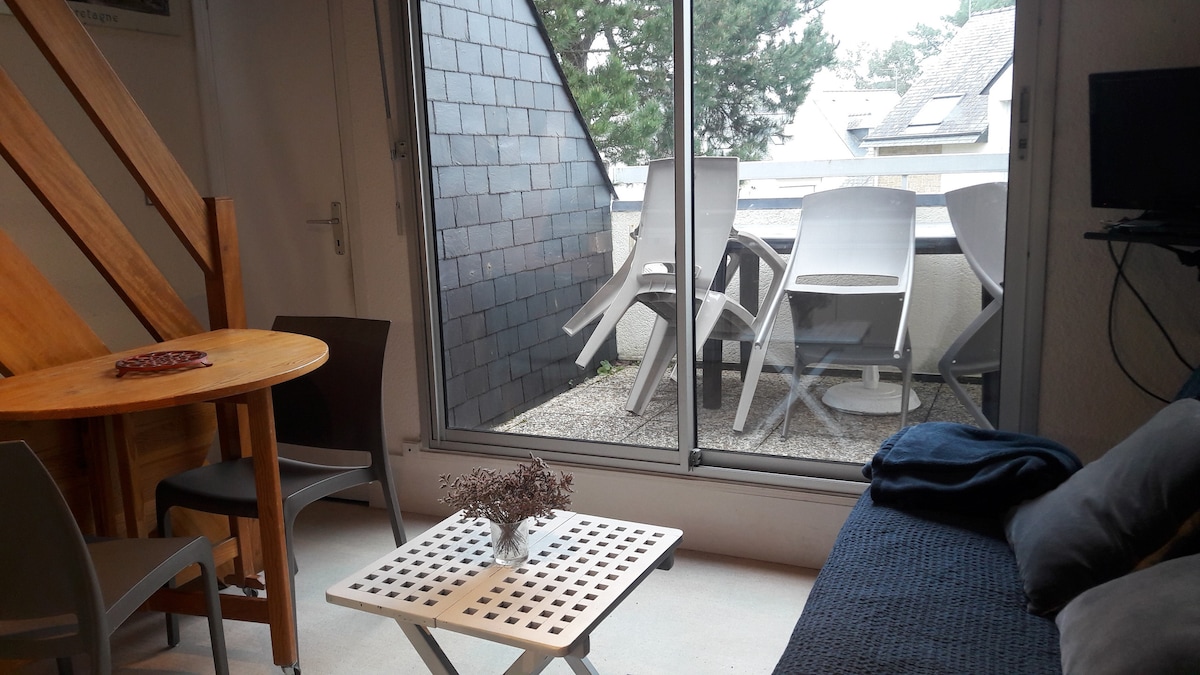 Appartement F2 de 42 m2 avec terrasse de 25 m2,sans vis à vis,plein sud dans une résidence calme et sécurisée.Tout confort,cuisine aménagée,WC séparé,place de parking privée.Couchage pour un bébé ou un jeune enfant.Le linge de maison est fourni .WI-FI.3 mn à pieds de la grande plage, Casino Jeux, piscine.A 2 mn en voiture de la Thalasso.Proche du centre ville et de l'embarcadère pour les îles.Local vélos.Ménage non facturé mais 30 €,à régler à la remise des clés si vous ne voulez pas le faire.