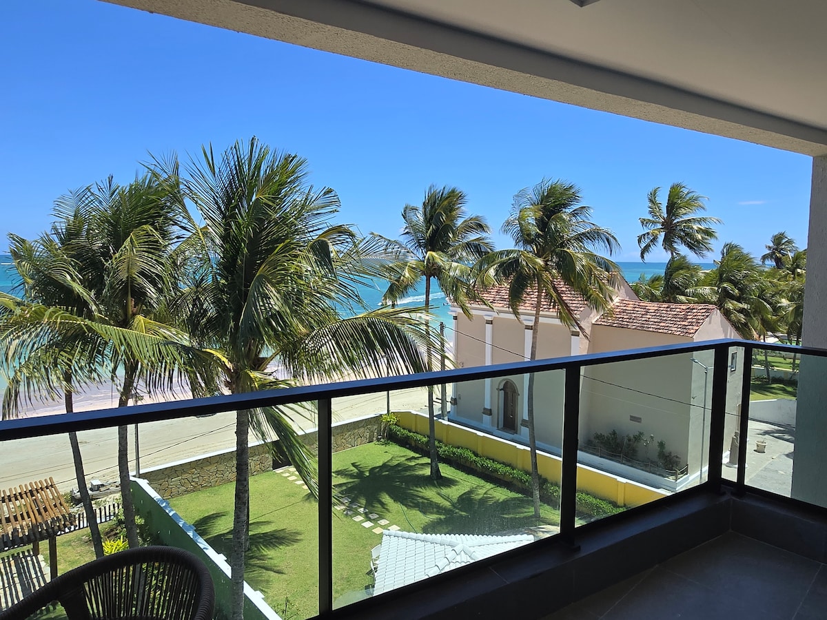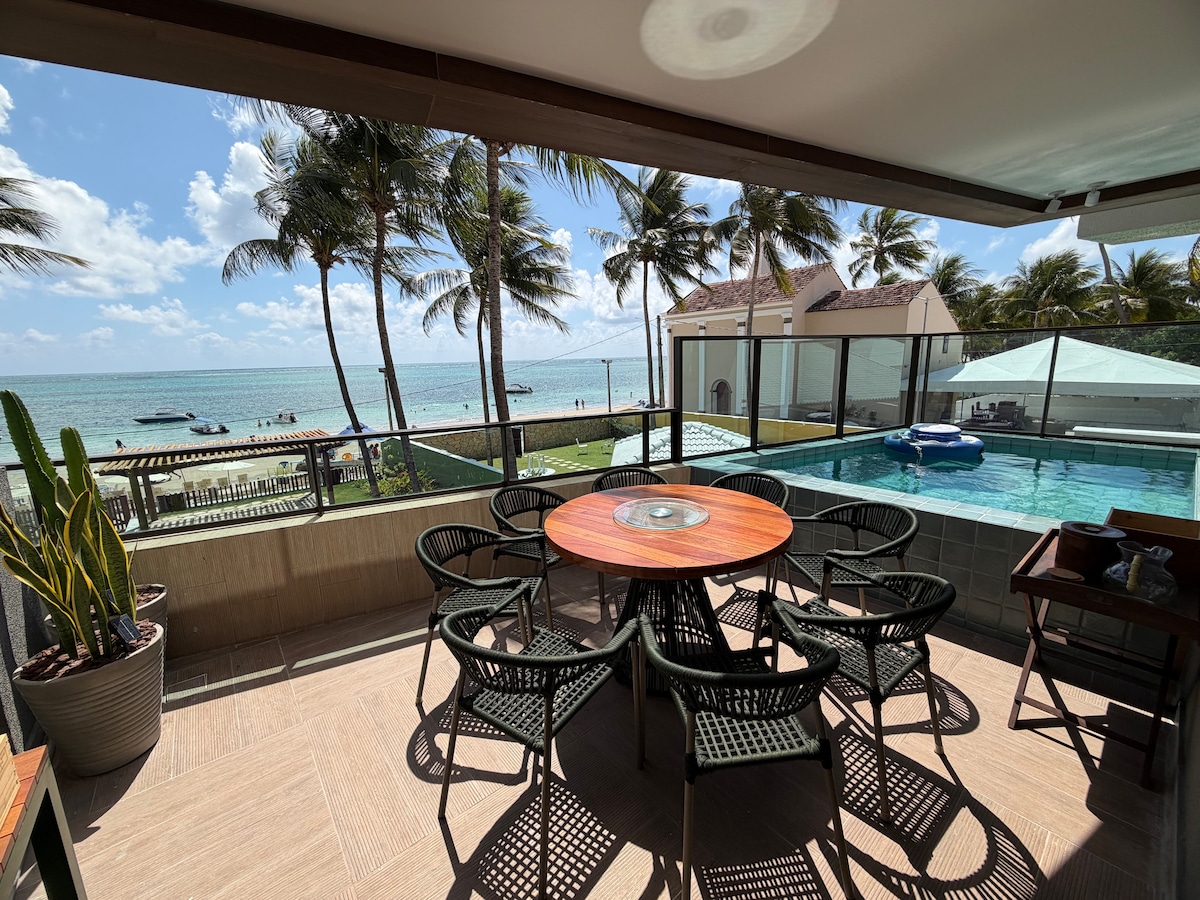 Melhor localização a beira-mar de Muro Alto. Praia simplesmente perfeita para família. Lindo apartamento vista mar e piscina, 3 banheiros sendo 1 lavabo+ 2 suites (uma com cama casal e outra com cama Queen reversível para duas camas solteirão) totalmente equipado, cozinha completíssima, smartTV, Wifi, varanda gourmet. Condomínio pé na areia super estruturado com serviço de praia, parquinho, campinho, mini mercado, academia e estacionamento