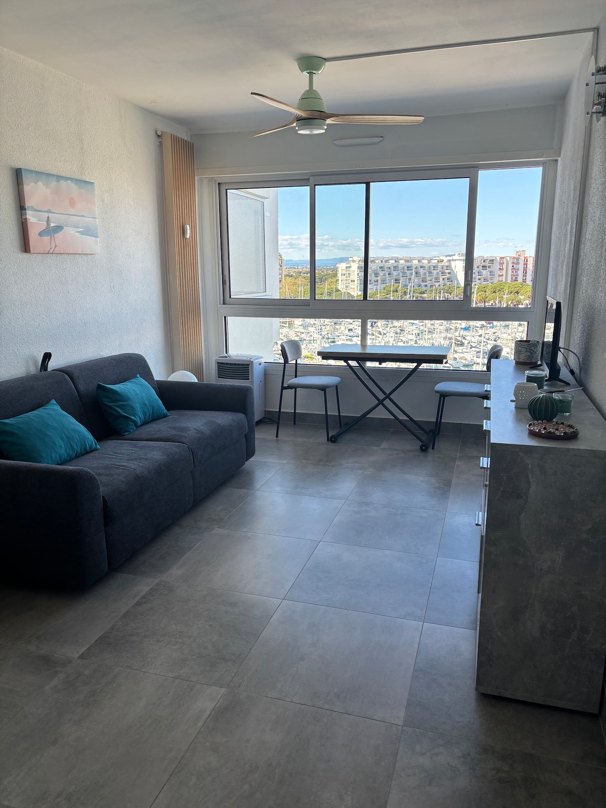 Entre port et plage, studio meublé pour 2 personnes entièrement rénové, au 7ème et dernier étage d'une résidence avec 2 ascenseurs Séjour avec canapé lit, pour la nuit des rideaux occultants ont été installés (absence de volets) Cuisine aménagée et équipée : plaque induction 2 feux, frigo, cafetière Senseo, micro ondes. Salle d'eau avec WC, douche, lave-linge 🅿Place de parking privée incluse, ce qui est indispensable pour votre tranquillité en saison estivale Local à vélos commun disponible