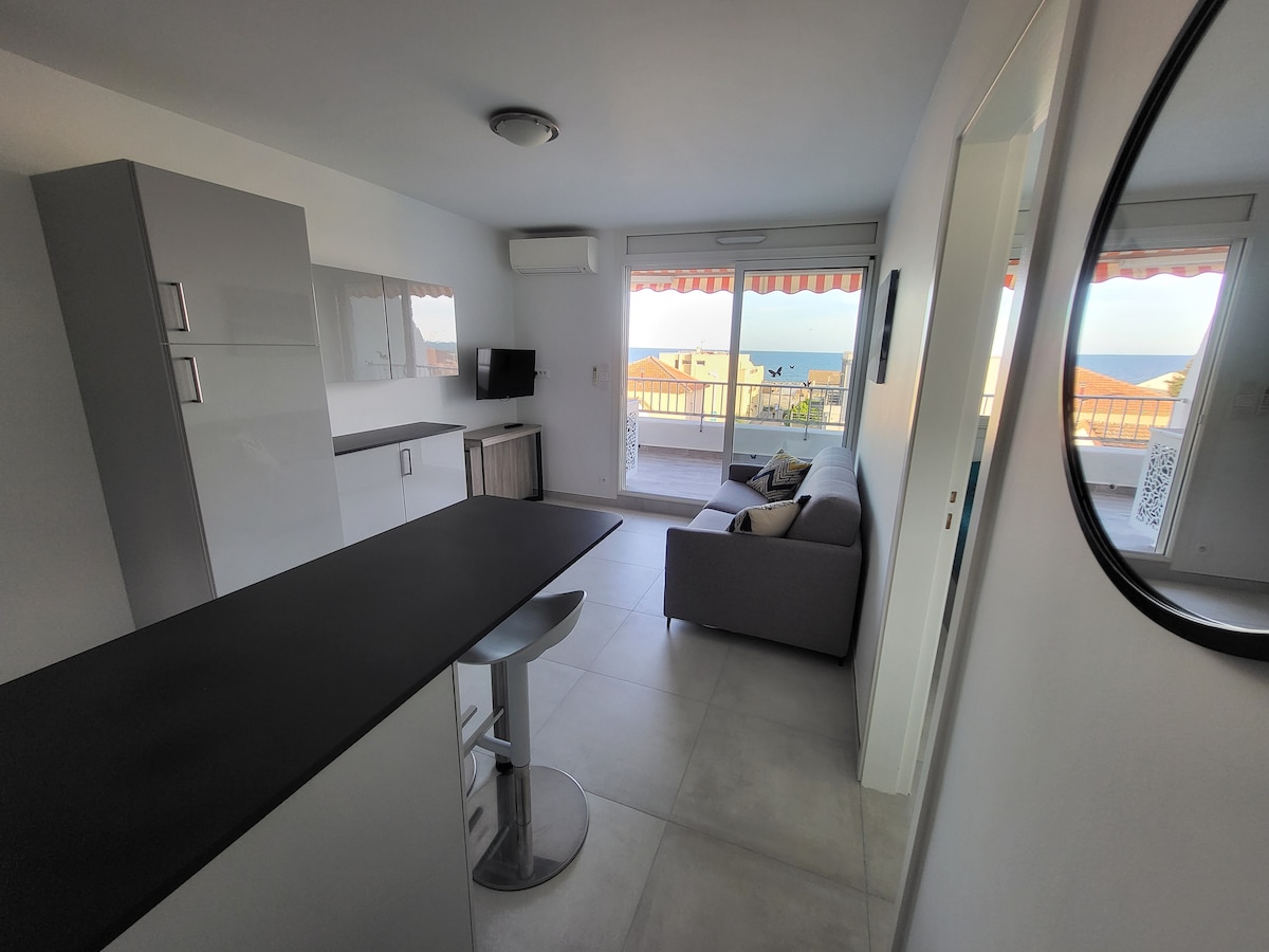 Entre port et plage, studio meublé pour 2 personnes entièrement rénové, au 7ème et dernier étage d'une résidence avec 2 ascenseurs Séjour avec canapé lit, pour la nuit des rideaux occultants ont été installés (absence de volets) Cuisine aménagée et équipée : plaque induction 2 feux, frigo, cafetière Senseo, micro ondes. Salle d'eau avec WC, douche, lave-linge 🅿Place de parking privée incluse, ce qui est indispensable pour votre tranquillité en saison estivale Local à vélos commun disponible
