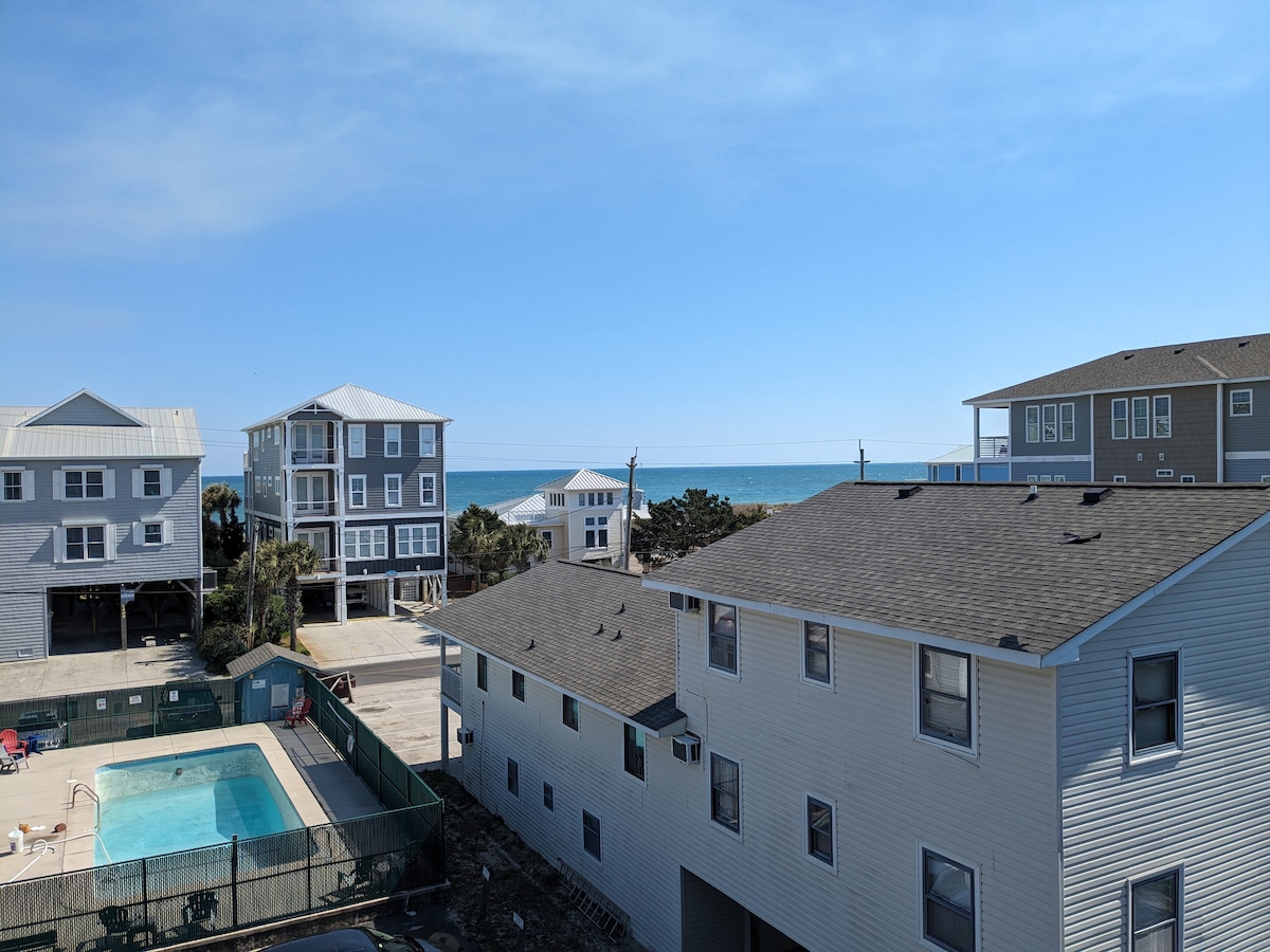 Welcome to this beachfront 2 bedroom 2 bath updated condo, with pool, close to the famous Carolina Beach boardwalk. The deck overlooks the ocean and provides AMAZING views, and there's a private walkway to the beach. It's an easy 5-10 minute walk to the boardwalk and many other bars and restaurants. The unit is freshly renovated with a light and modern feel and is a true oceanfront paradise. Stay here and enjoy relaxing on the deck, listening to the waves, and watching for dolphins!