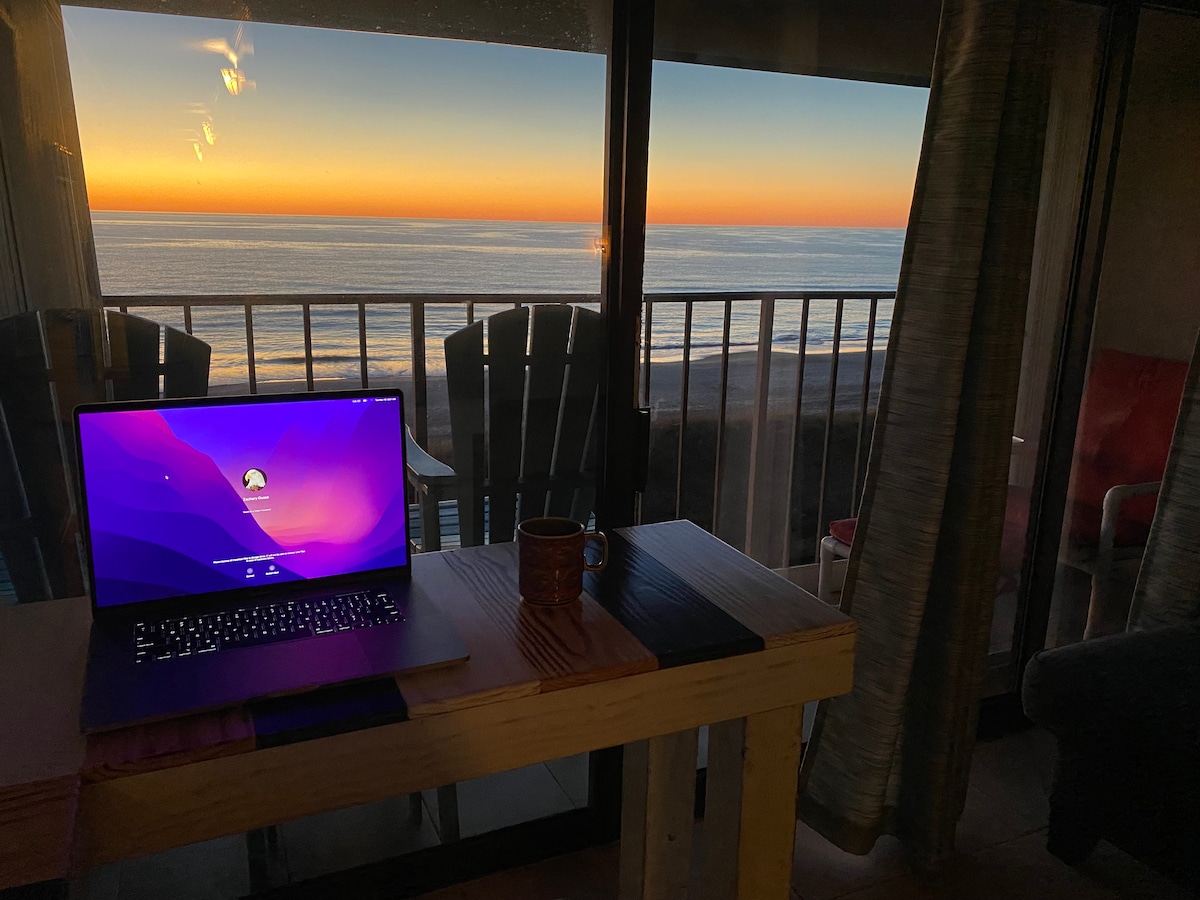 Kick back and relax in this calm, stylish space that is oceanfront. Enjoy coffee or cocktails in the deck while watching the waves. Just steps from the beach with a garage to store all your beach and ocean toys. Everything you need is provided for your stay. Enjoy the pool and grilling area in the complex. Free parking on site. The boardwalk is 1.5 miles away with plenty of things to do and places to eat but far enough away that you have peace and quiet.