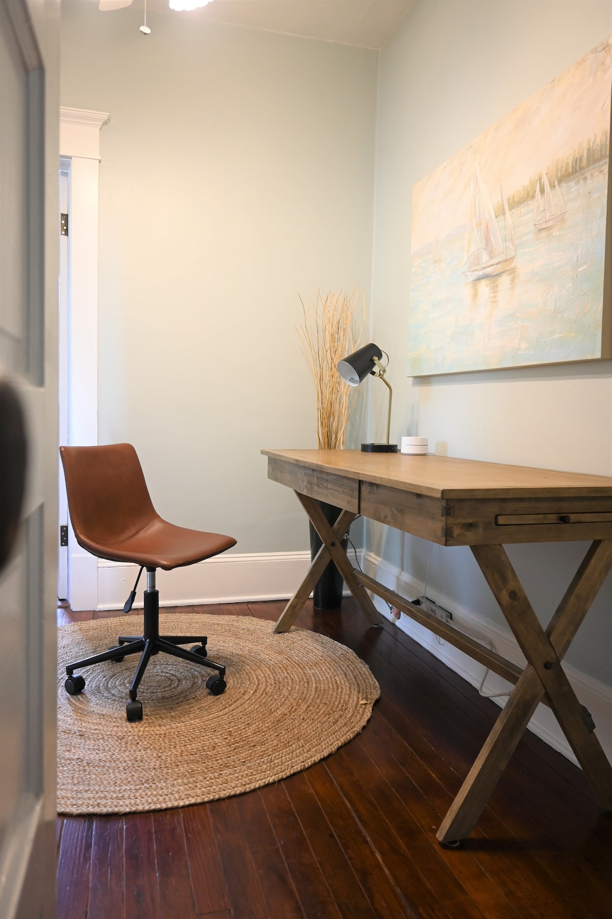 Our second-floor hideaway is the perfect perch for exploring downtown Wilmington and nearby beaches! Located in one of Wilmington's most sought-after neighborhoods, and popular with the film industry as a shooting location, this area is rich in film and television history! This one-bedroom with a dedicated office, efficiency kitchen, and mid-century modern bathroom is nestled in the upstairs back corner of our historic home, circa 1910, steps from the Cargo District, & a short walk to downtown!