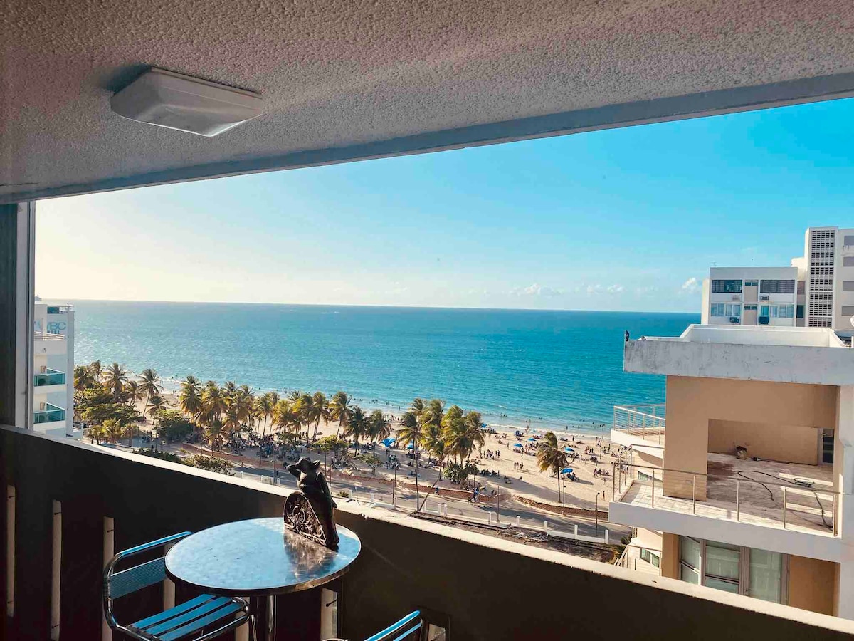 Beautiful, quiet beachfront apartment located in the middle of Isla Verde Beach with ocean views from every window. Just step outside and jump in the beach or walk either east or west and you will find beach-lounge and umbrella rentals, surfing schools, several hotels, food kiosks, banana boat and jet ski rentals and lots of fun. Free parking, fully equipped kitchen, luxurious 1,250 thread count cotton bed sheets, 55" TV, high-speed internet (250mega) and many board games. Paradise!