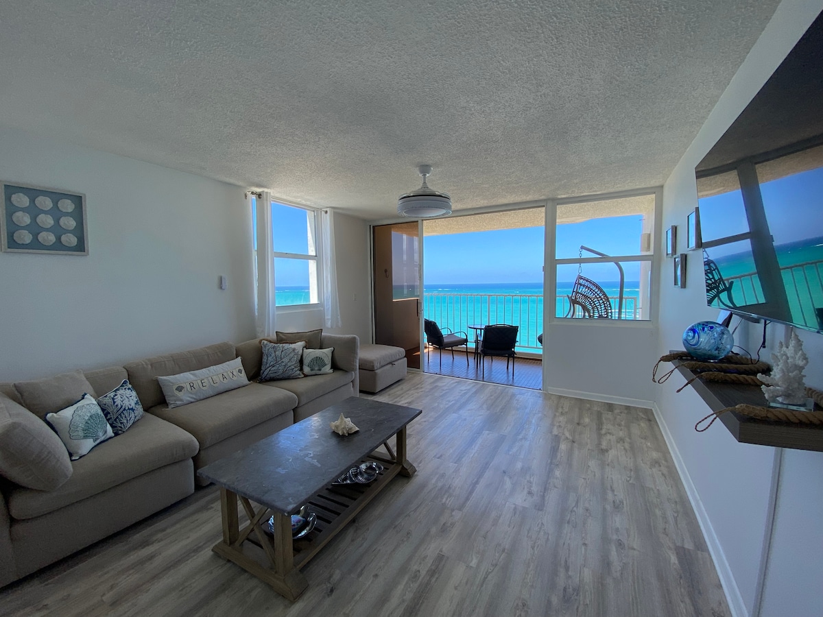 Amazing, fully remodeled, 3 bedroom 2 full bath beachfront condo in the heart of Isla Verde Beach (San Juan nicest beach). Perfect for gathering of family & friends. You will be close to everything when you stay at this centrally-located place. Walking distance to many restaurants, beach bars, supermarket, nightlife and casino. 5 mins airport drive. Condo has amazing ocean views and a large open style kitchen perfect to bring the whole group together. It has million $ view from the balcony