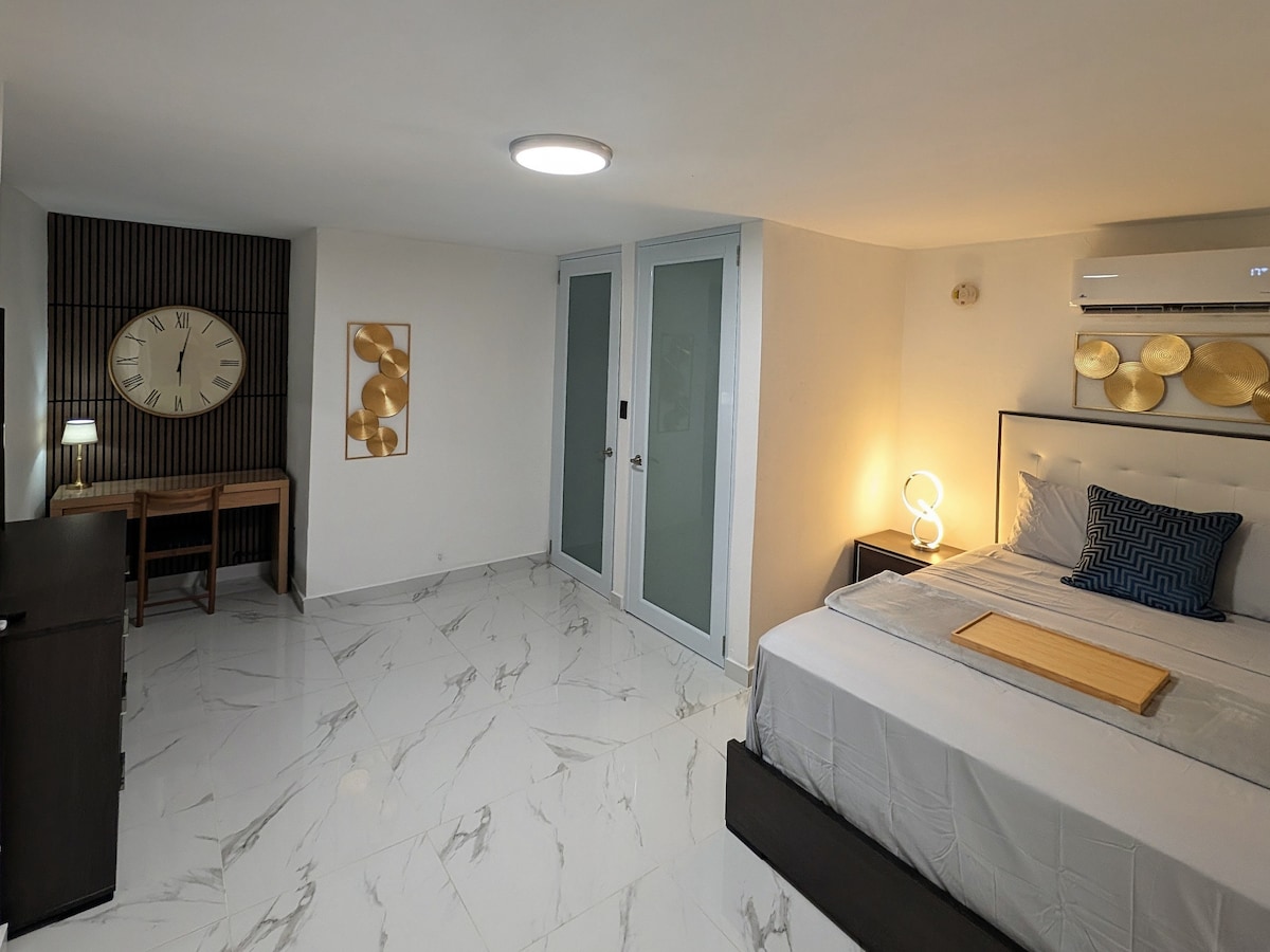 Lovely 2 guests 1 a/c room apartment with 1 queen bed in a 3apt house, 1 bathroom and kitchen. Located in a normal puertorrican working class neighborhood (time in car) 7mins from the Airport, 8mins from beach, 12mins from Condado and Piñones, and 20mins from Old San Juan and Plaza Las Americas. Near the area you may find gas stations, 24/hr supermarket, fast foods, restaurants and rental cars. Check in with keybox. SmartTV.