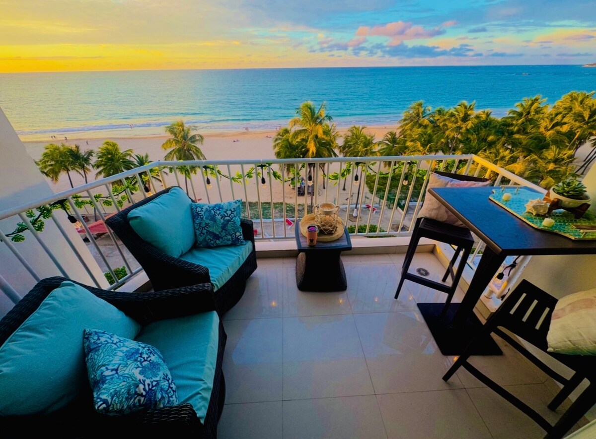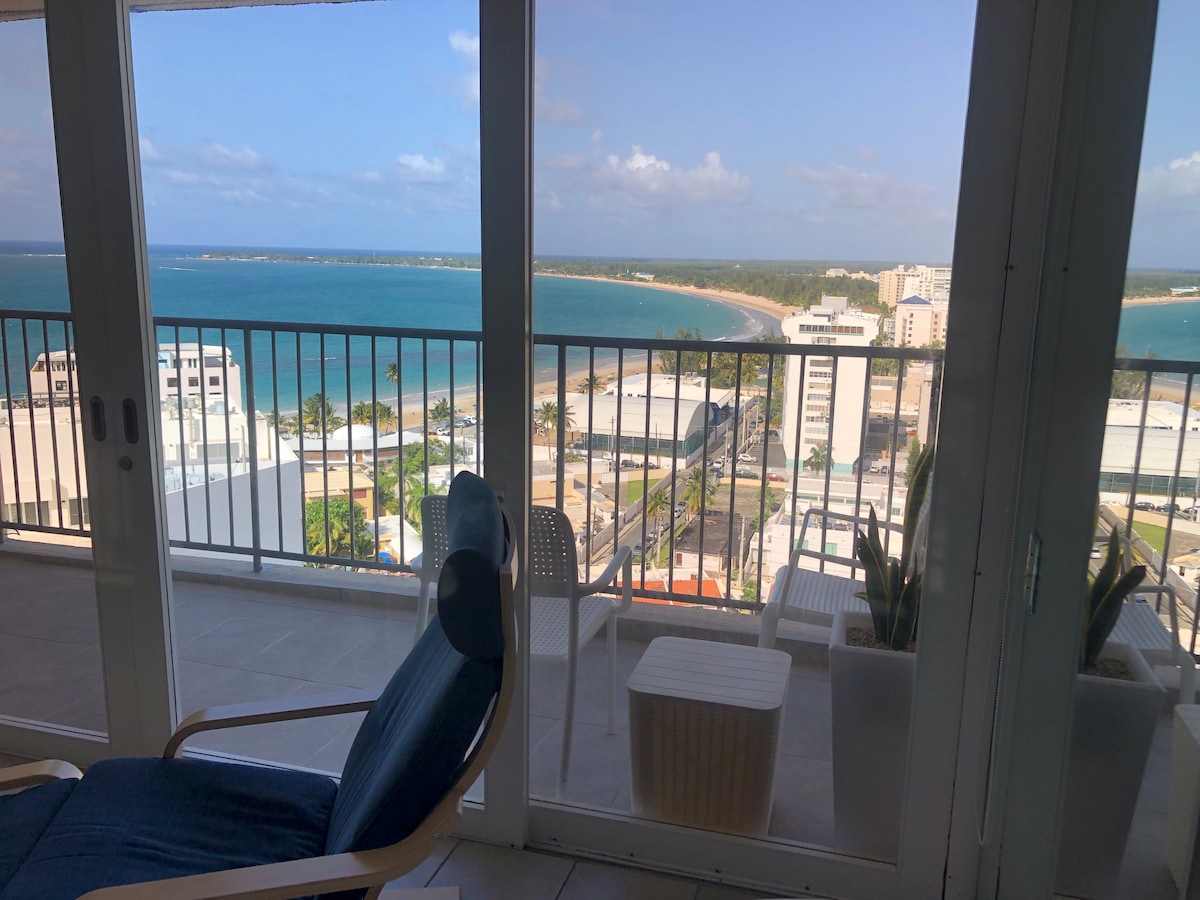 Ocean Front! Balcony. Cement tile floors. Updated kitchen & bathroom. Equipped for a beautiful beach vacation. WiFi, 2 big flat screen TV's. Gorgeous view of the ocean and beach. Private balcony. This condo is on the beach and has pool, sports courts, patios, barbeque & picnic area and outside exercise area. We are located just 10 minutes from the San Juan ( SJU) airport. We share same smooth white sand beach with the famous El Juan Hotel and other 5 Star hotels.