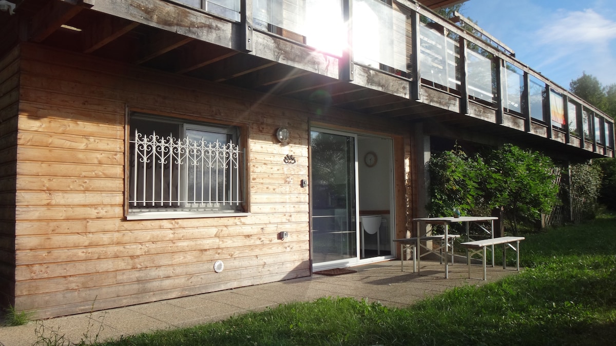 Logement ossature bois cosy, choix de matériaux et d'équipements de qualité. Environnement très calme, large terrasse (27 m²) donnant sur potager bio. Equipement complet : Lit king size, tout électroménager disponible. Douche à l'italienne, petit électroménager haut de gamme. Salon de jardin, barbecue. Genève à 15 mn, Annecy à 25 mn, Chamonix 45 mn, Yvoire et bords du lac Léman 30 mn, plateau des Glières 20 mn proximité des stations de ski. Petits déjeuners variés. Wifi. Stationnement.