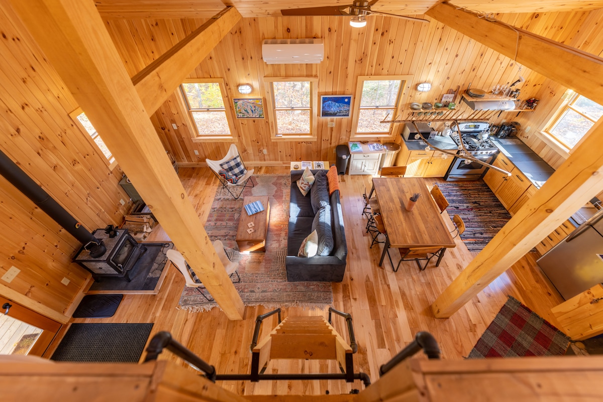 This cabin is anything but ordinary! Nestled on an open bluff in the woods of Kingfield, Maine this architectural wonder is a perfect getaway for a couple or group. It's a warm and cozy space to come back and unwind after a long day of hitting the slopes or any four season activity. The open concept living room and newly remodeled kitchen have modern amenities like an espresso machine, Smart TV, and comfortable furnishings that will make you feel at home. Only 20 minutes to Sugarloaf Mountain!