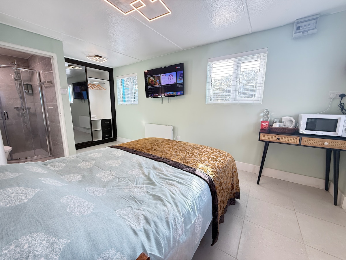Room to relax in this timber cabin with garden views. Hot water flows from the rain head shower. Take time to relax after a busy day of exploring Cork in the luxury bath! Central heating, Wifi, King size bed, Tea and Coffee facilities. Free car parking space and close to two local bus services. Five minute drive from Cork Airport and Twenty minutes drive to Kent railway station. We are happy to pick up from either!