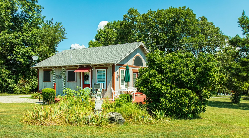 Mini Cabin # 3 sits on 90 Acres of Campground in the Beautiful Ozark Mountains! Cabin #3 comes with a Queen Bed, a Small Fridge, Microwave, Coffee Pot and a Full Private Bathroom, a BBQ grill in the back and a Picnic Table with a Fire Pit in the Front. The T.V 's are for watching movies only, no reception. We do keep movies in the office for guests that can be checked out during office hours. There is a full kitchen area that is available for a separate fee. (Ask for details) These mini cabins are in a group of four that are connected with a large front porch and walkways between each cabin.